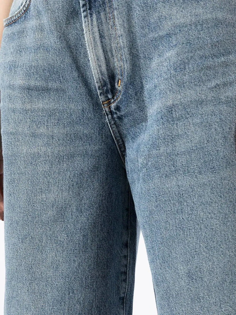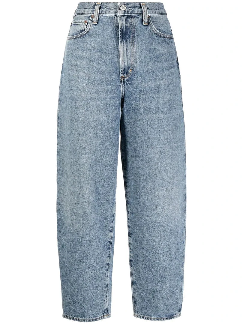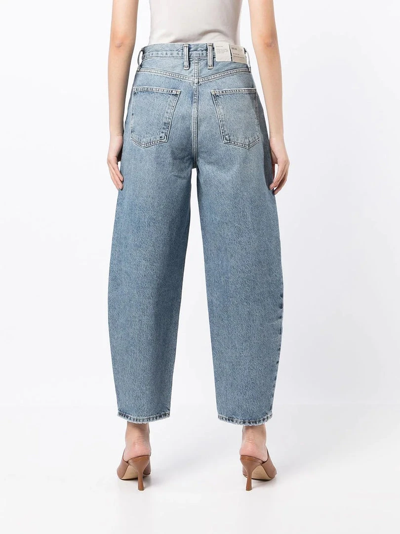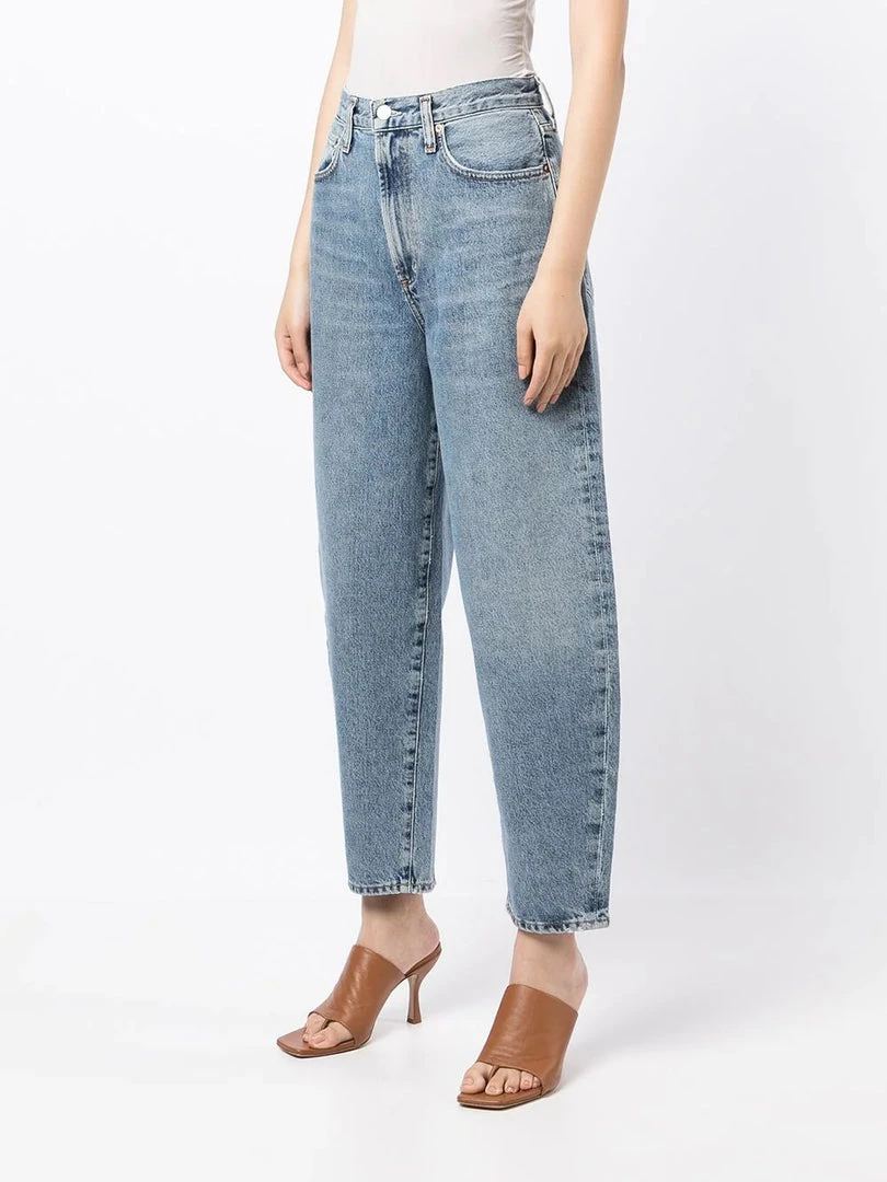 Agolde ‘Balloon High Rise Curved Taper Jeans’ featuring a front button and zip fastening, belt loops, a five pocket design, a balloon tapered leg, a high rise style and a medium blue denim wash. Item fits true to size. Model is wearing a size 26 W.Â