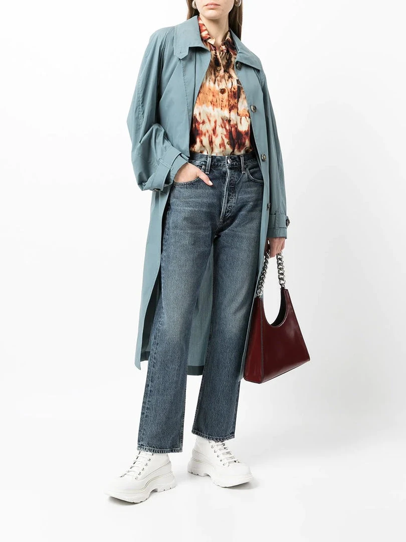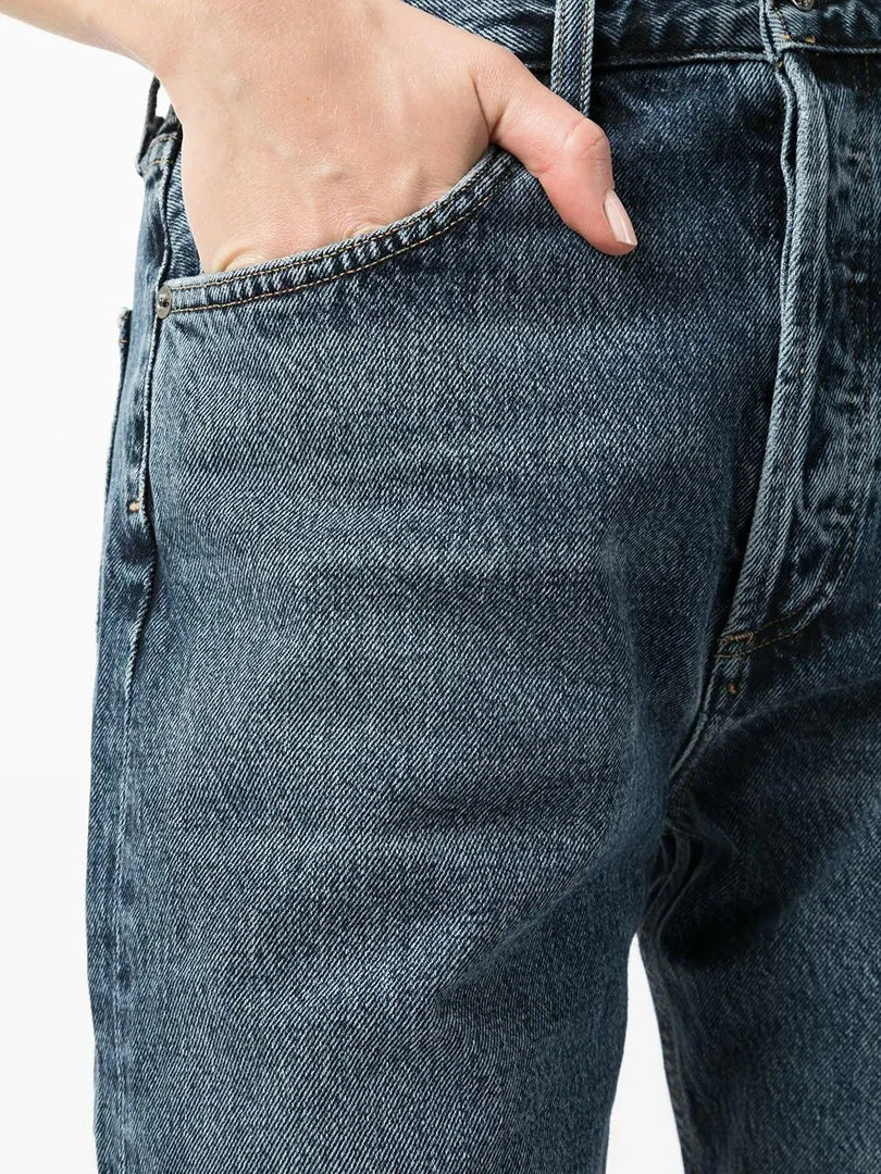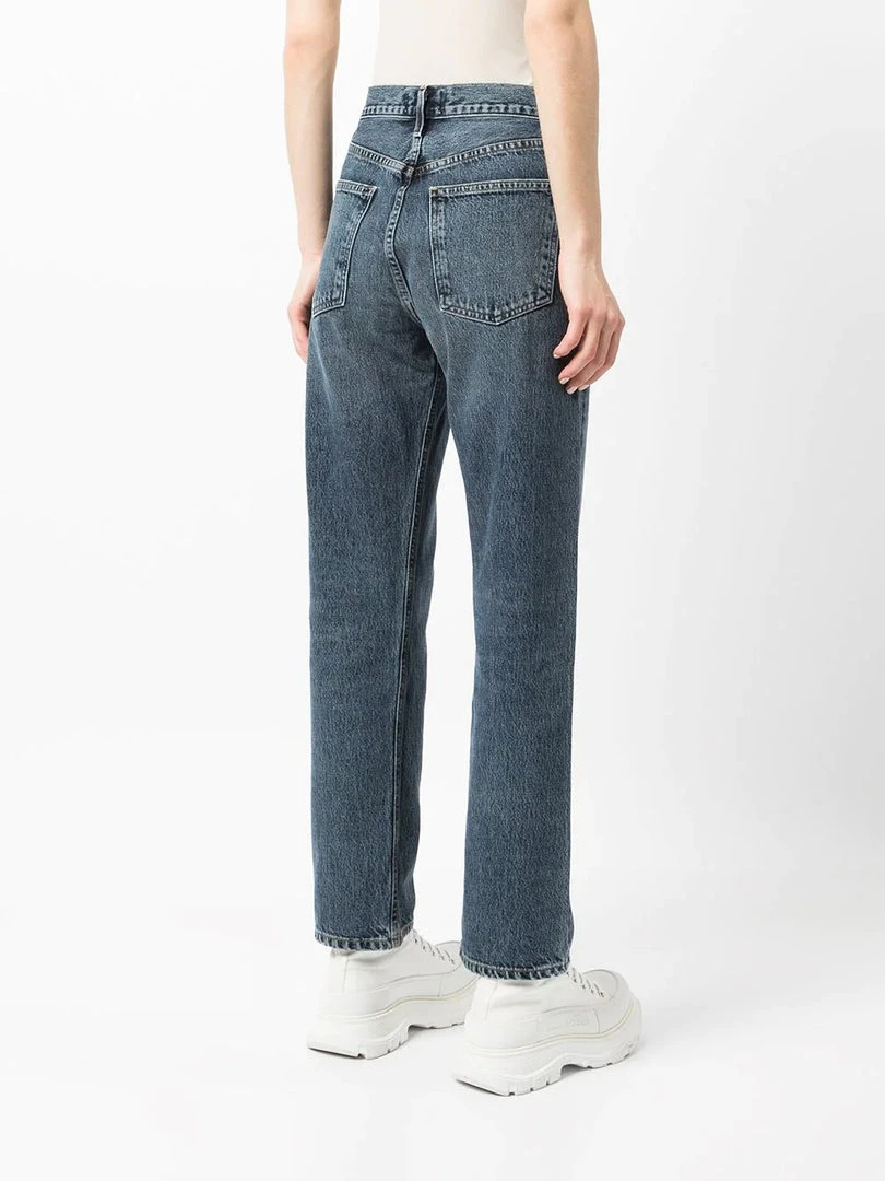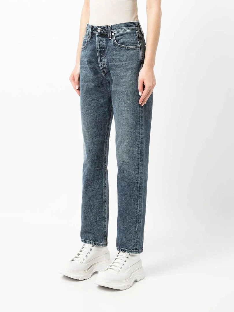 Agolde dark blue ‘90s Pinch Waist High Rise Jeans’ featuring belt loops, front button fastenings, a five pocket design, a straight leg fit and a high waist style. Item fits true to size. Model is wearing a size 27W.