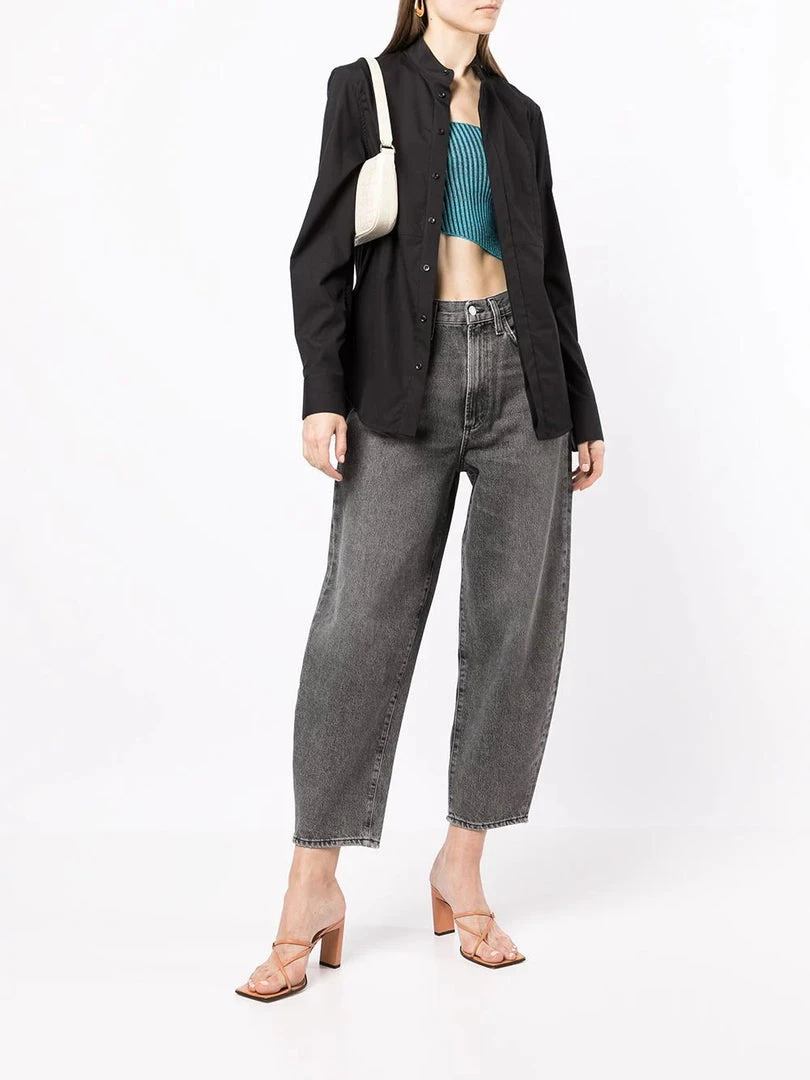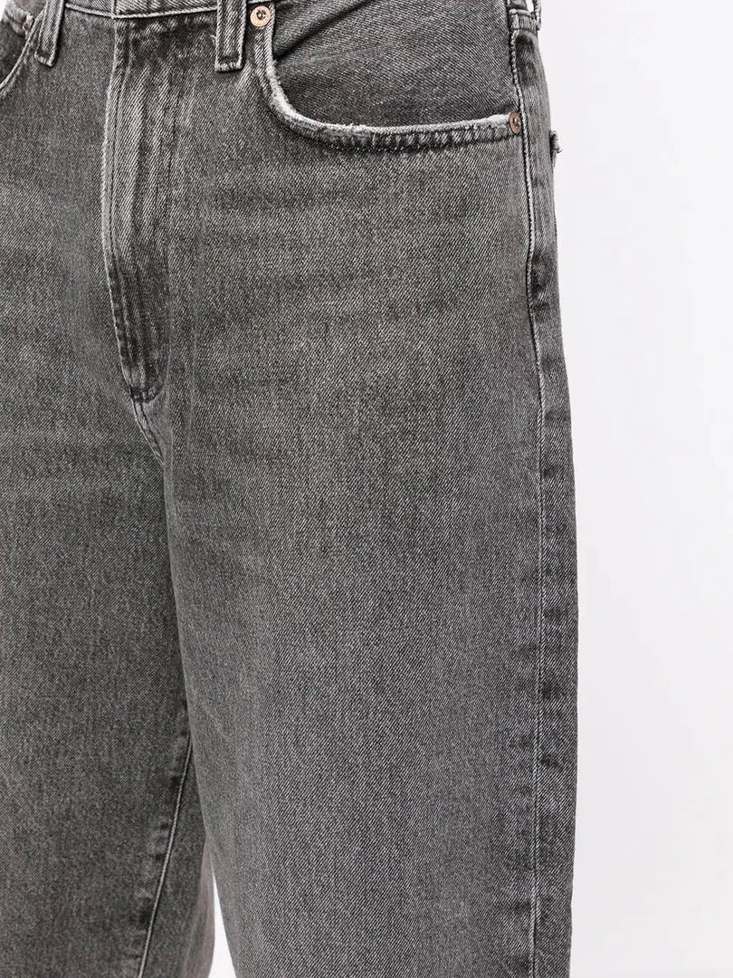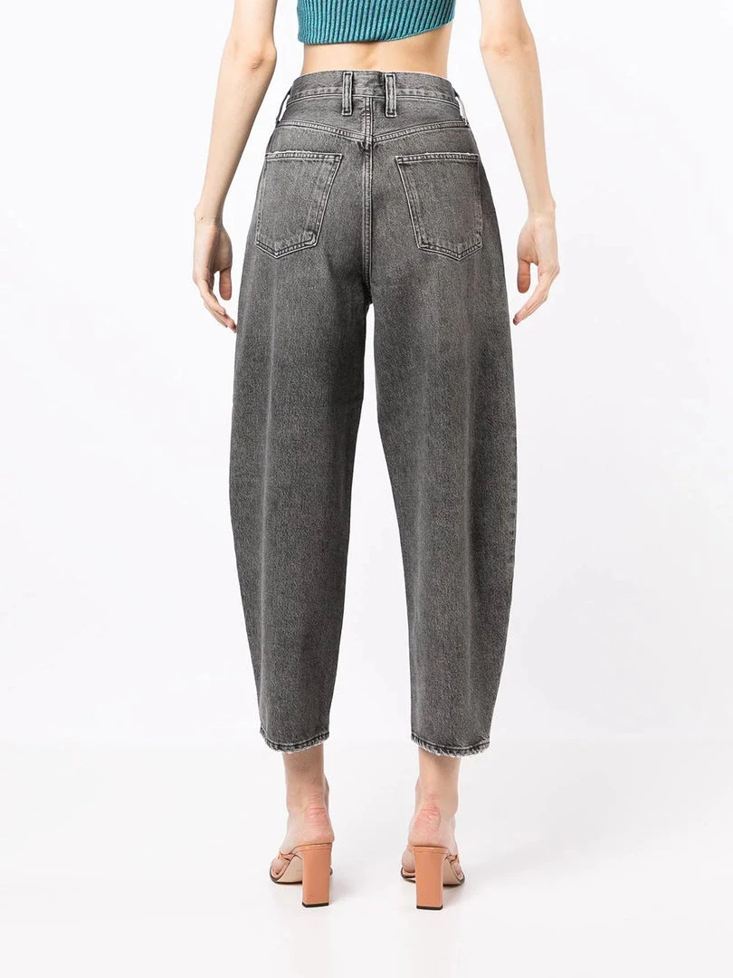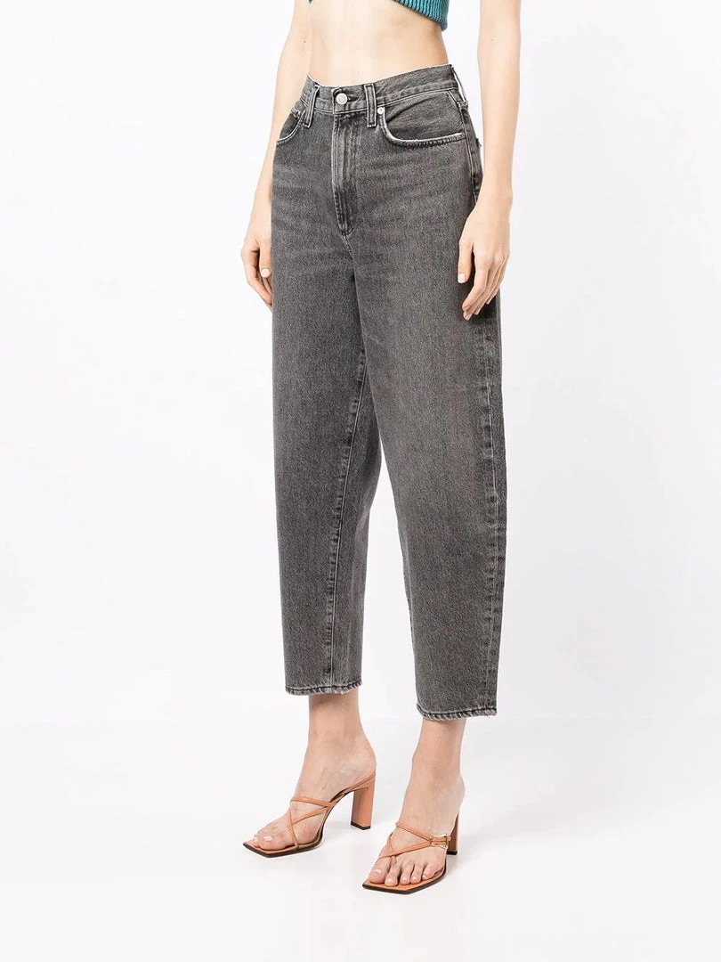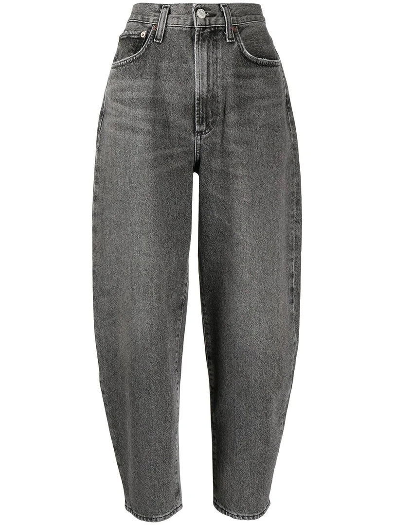 Agolde ‘Balloon High Rise Curved Taper Jeans’ featuring a front button and zip fastening, belt loops, a five pocket design, a balloon tapered leg, a high rise style and a grey denim wash. Item fits true to size. Model is wearing a size 27 W.