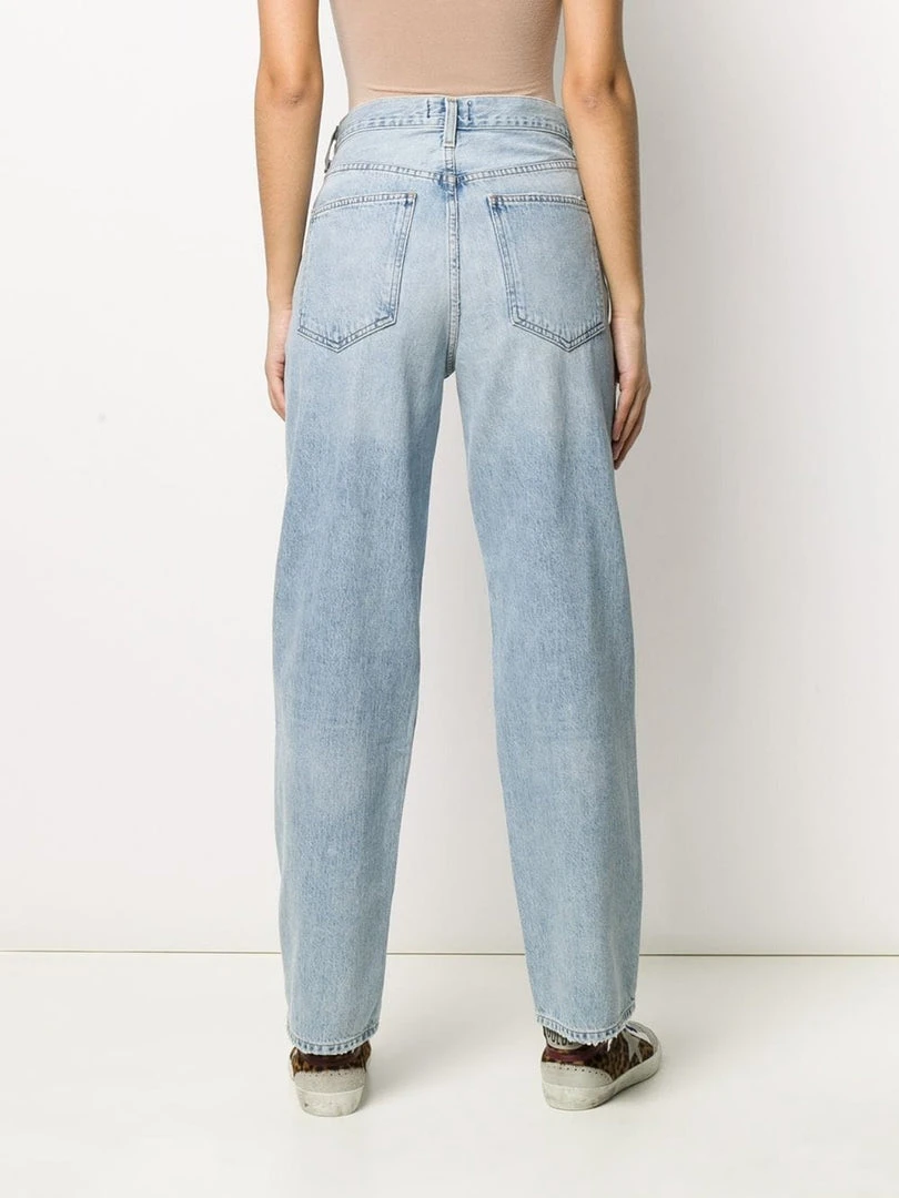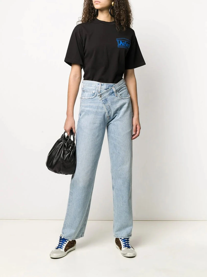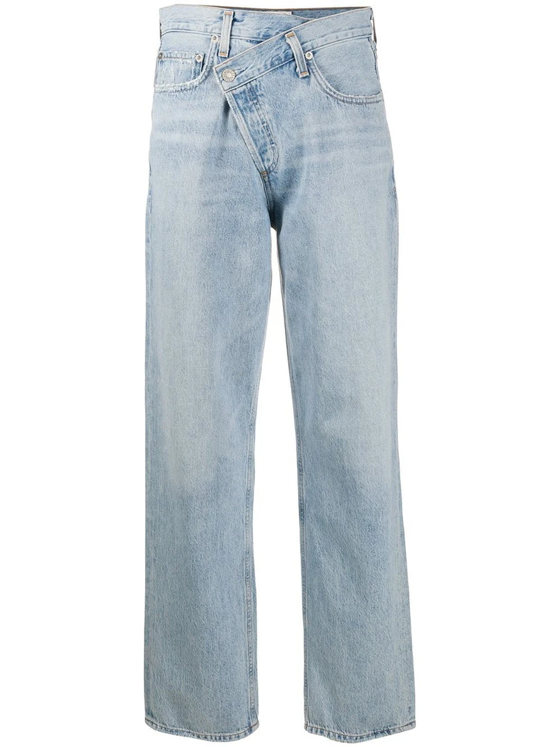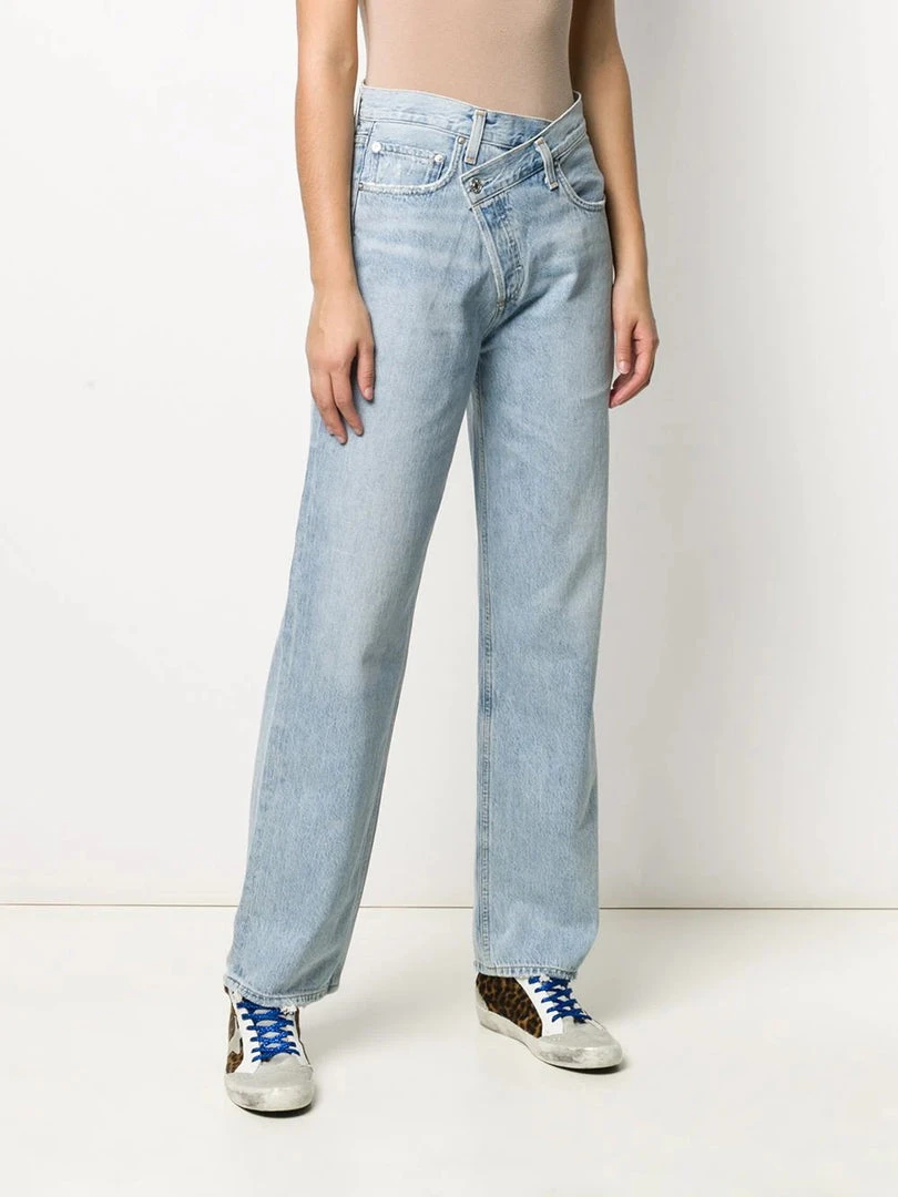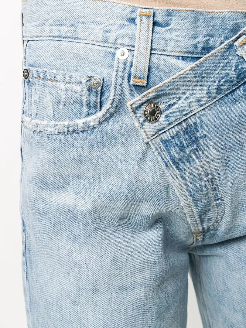 Agolde ‘Criss Cross Styled Jeans’ featuring asymmetrical front button fastenings, belt loops, a five pocket design, distressed details, a high rise style, a straight leg fit and a light blue denim wash. Item fits true to size. Model is wearing a size 27 W.