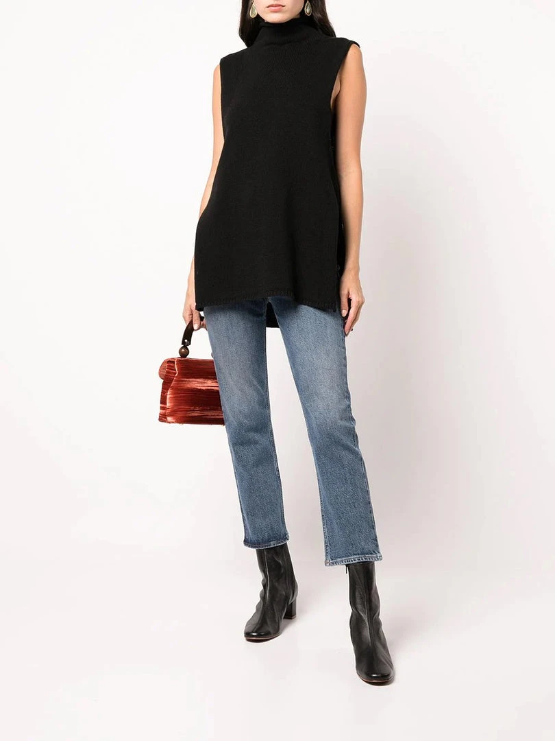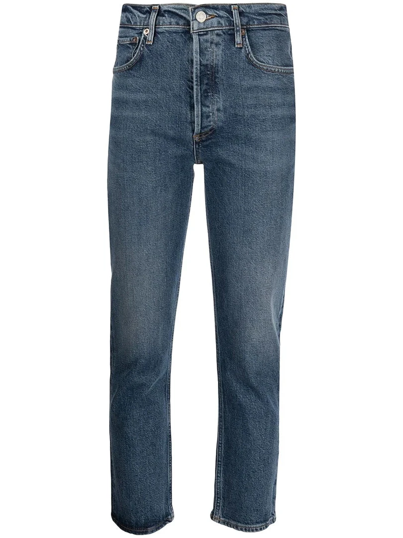 Agolde medium blue ‘Riley Crop High Rise Jeans’ featuring belt loops, front button fastenings, a five pocket design, a cropped straight leg fit and a high waist style. Item fits true to size. Model is wearing a size 27W.