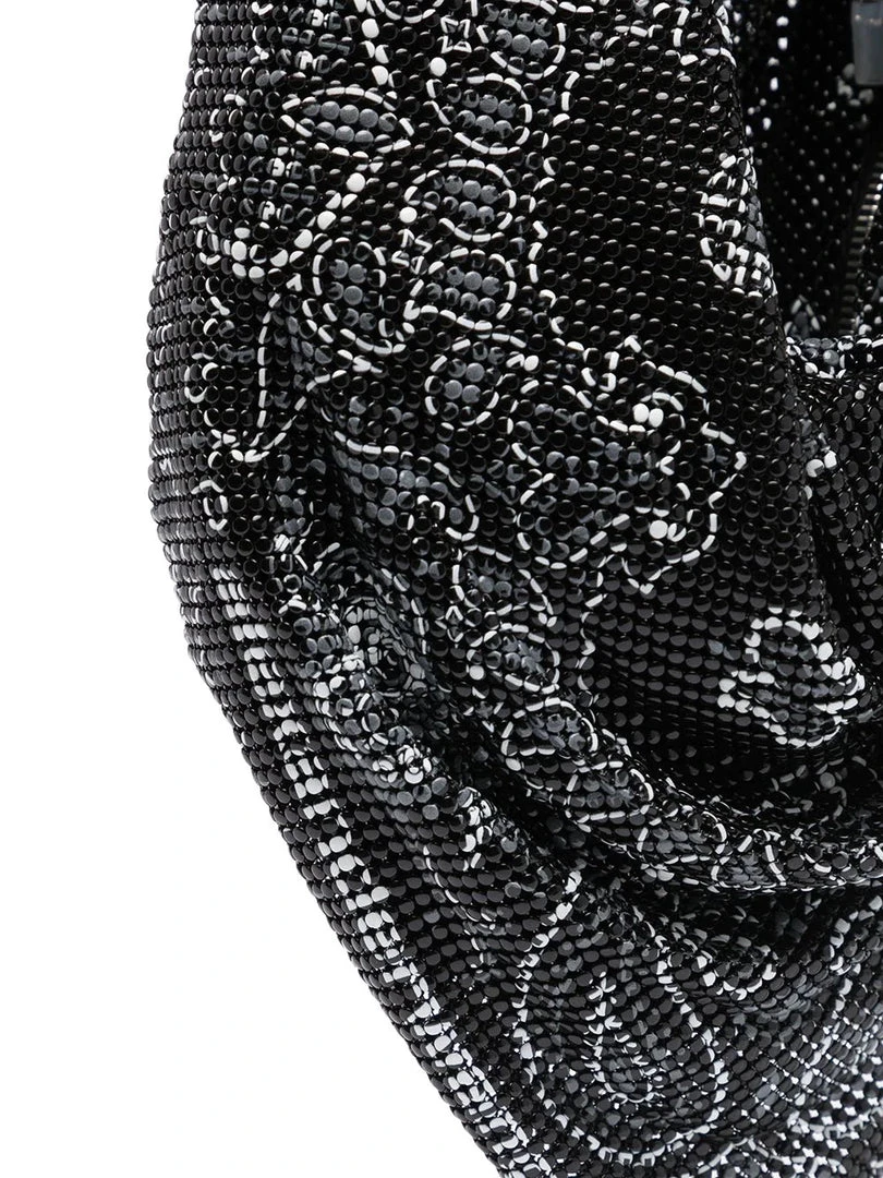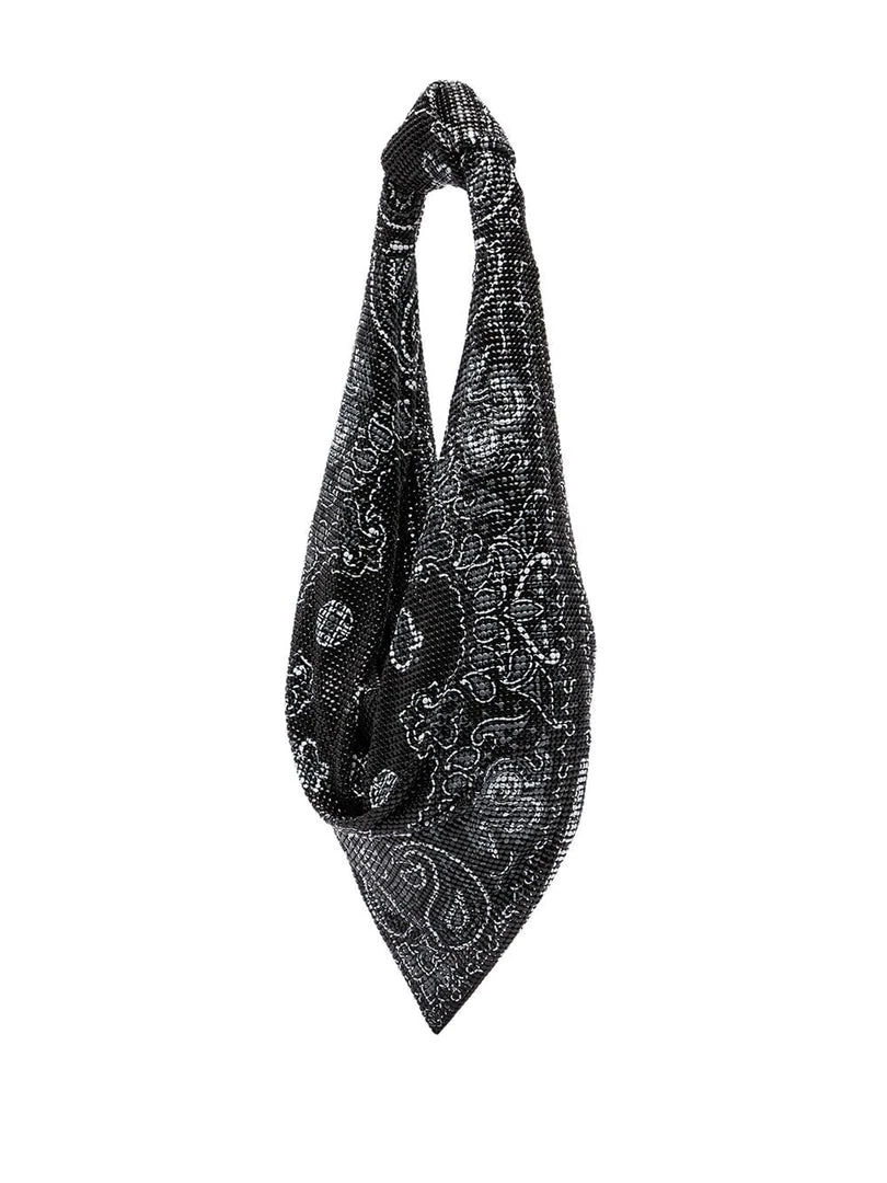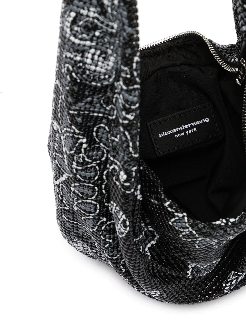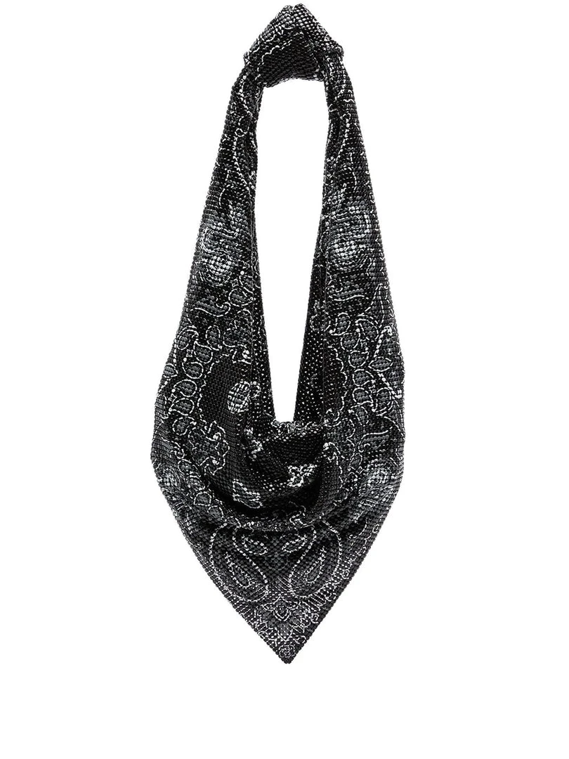 Alexander Wang black ‘Bandana Scarf Bag’ featuring a knotted handle, a top zip fastening, a chainmail design, a vintage grey and white bandana print, a small style and silver-tone hardware. Made in Vietnam.