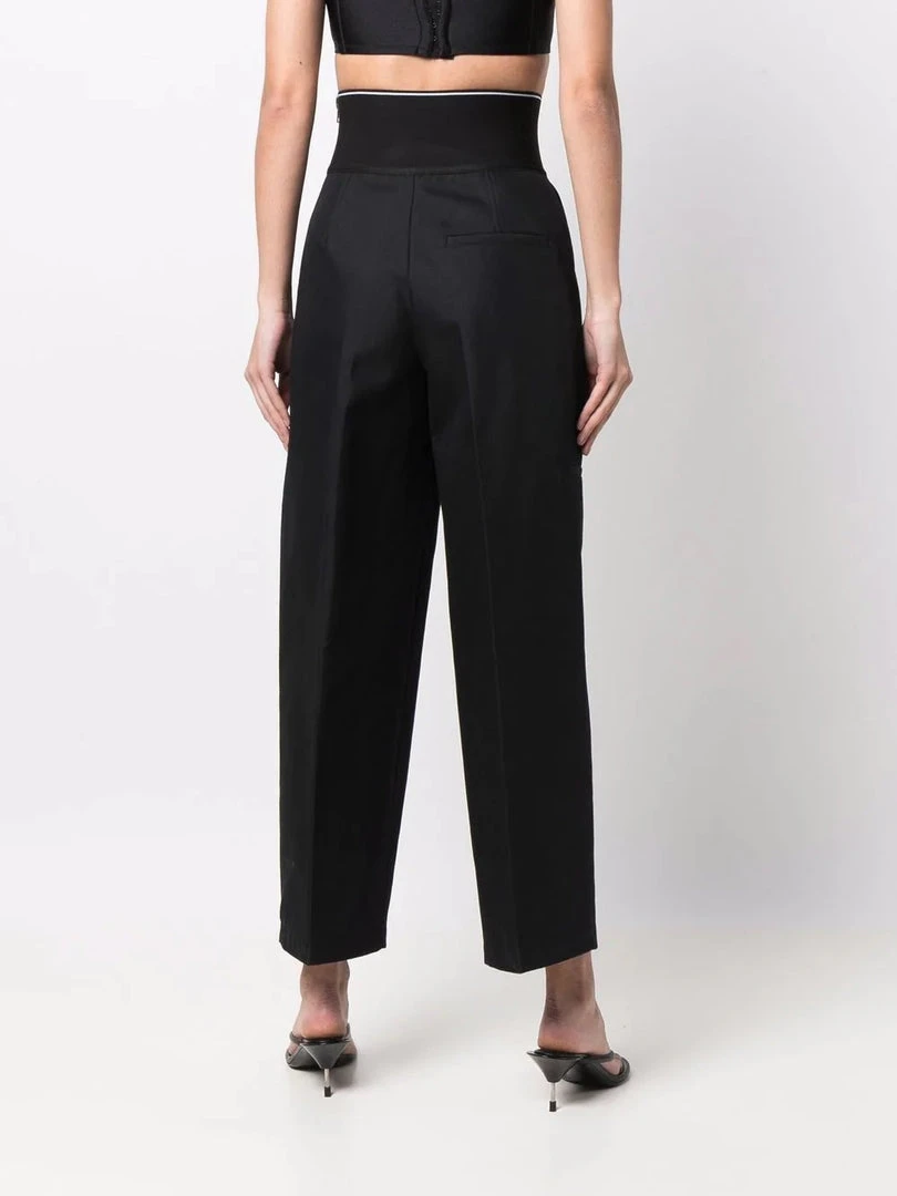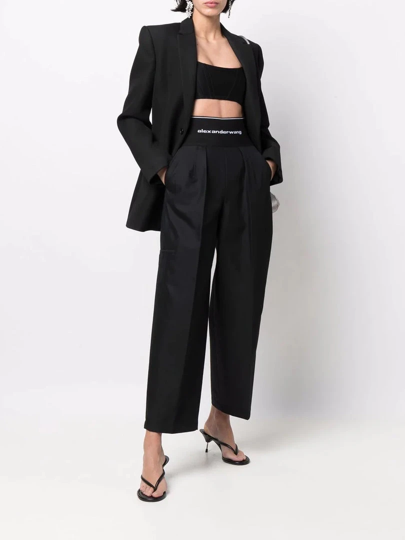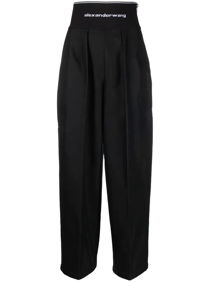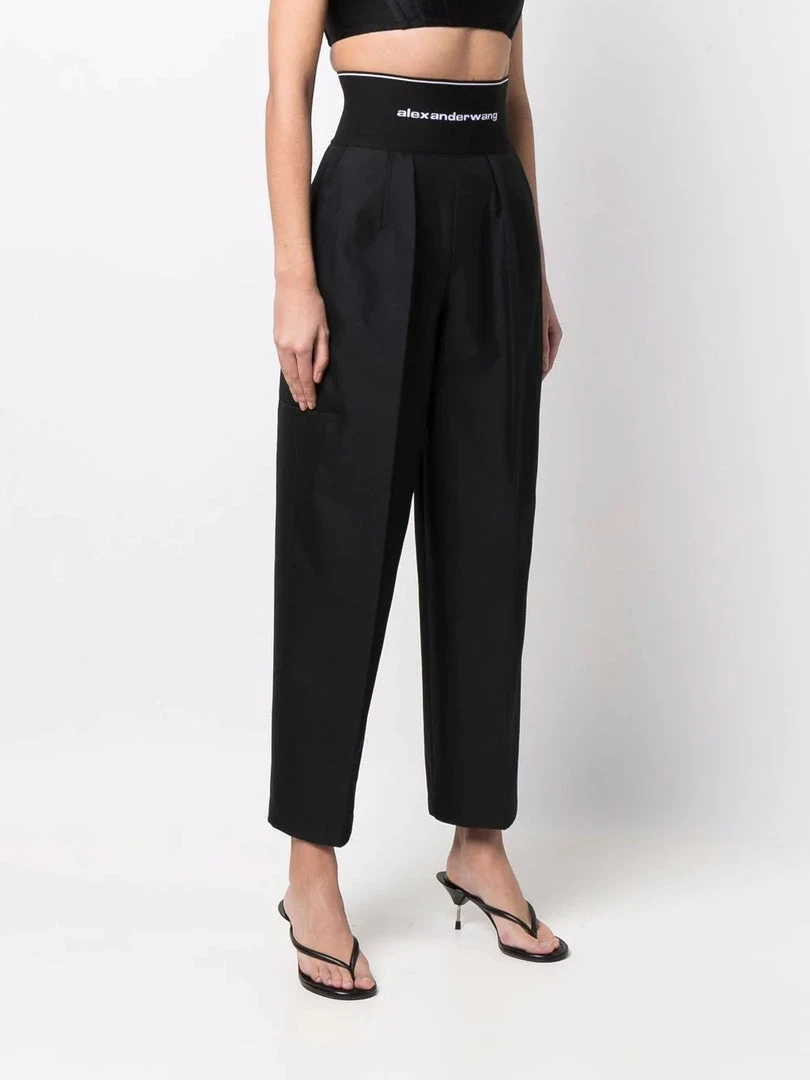 Alexander Wang black ‘Logo Waist Carrot Shaped Trousers’ featuring a high waist style, an elasticated waistband with a branded design, a side zip fastening, side slip pockets, a back pocket detail and pleated features. Item fits true to size. Model is wearing a size 4 US.Â