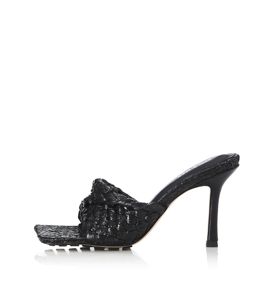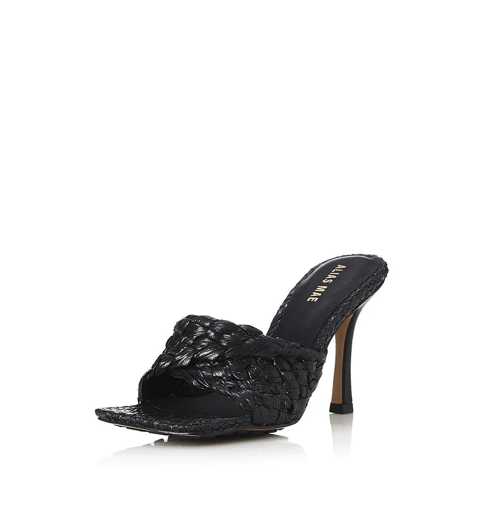 Alias Mae black ‘Lennon’ mules featuring a square open toe, a woven design, a branded insole, a 10cm heel and a slip on style. Made in China. Item fits true to size. European Sizing.