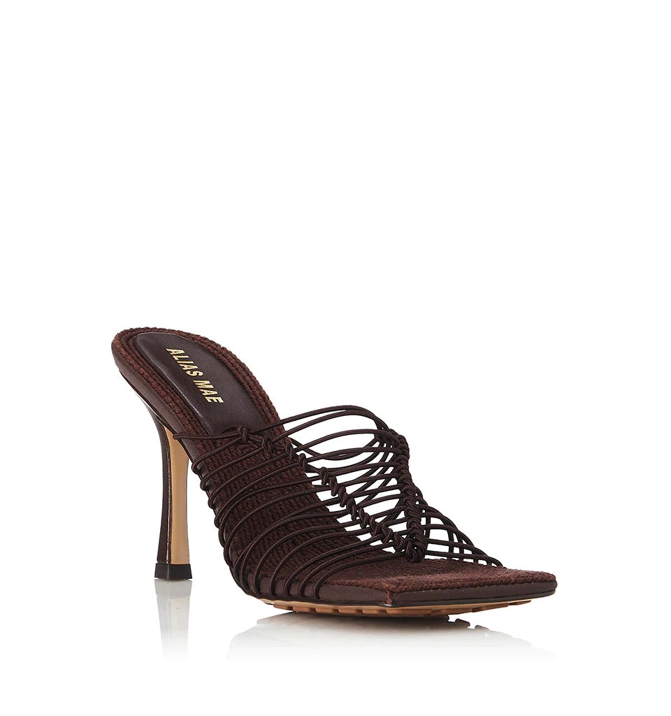 Alias Mae brown ‘Lettie’ mules featuring a square open toe, an elasticated caged strap design, a branded woven insole, a 9cm heel and a slip on style. Made in China. Item fits true to size. European Sizing.