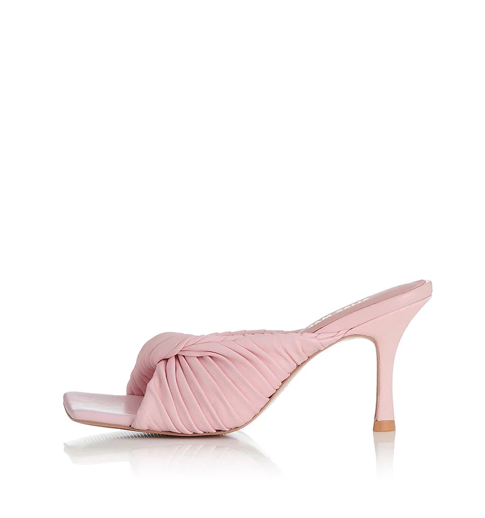 Alias Mae pink ‘Flora’ mules featuring a square open toe, a woven design, a branded insole, a 7cm heel and a slip on style. Made in China. Item fits true to size. European Sizing.