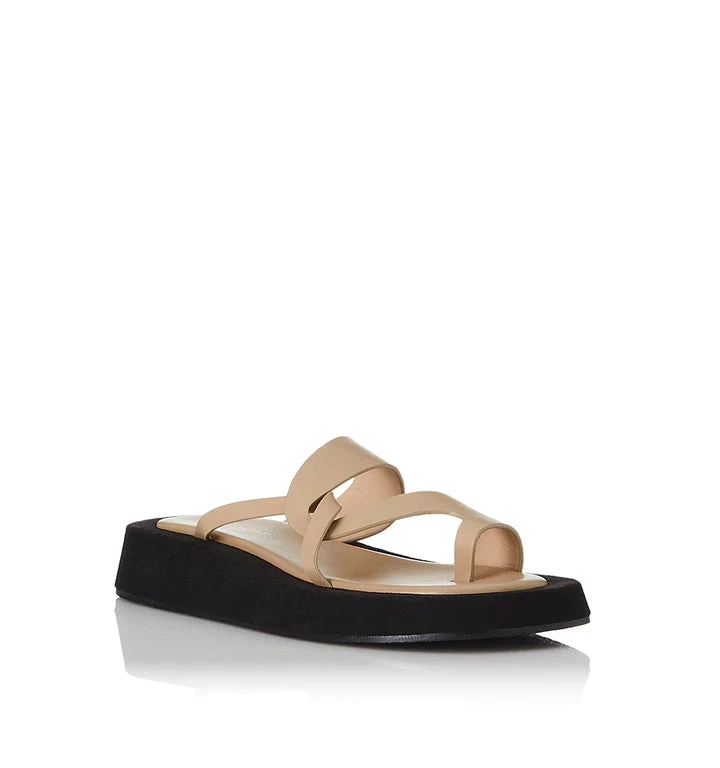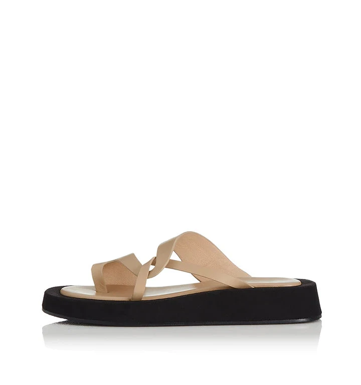 Alias Mae beige ‘Polo’ sandals featuring a thong toe, an abstract intertwined strap design, a branded insole and a slip on style. Made in China. Item fits true to size. European Sizing.