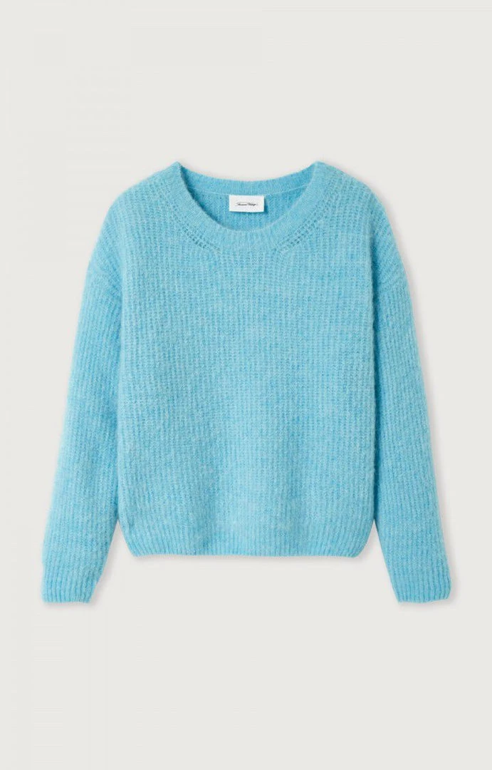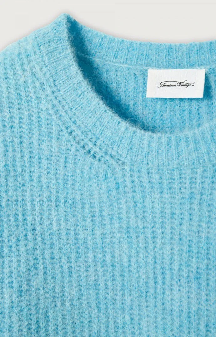 American Vintage blue ‘East 18F RN’ knit sweater featuring a round neckline, long sleeves, ribbed hems and pulls on. Item fits true to size.Â