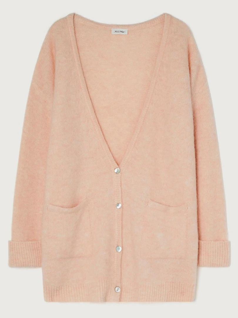 American Vintage light pink oversized ‘East’ melange knit cardigan featuring a V-neckline, front button fastenings, dropped shoulders, long sleeves with turned up cuffs, two front patch pockets and a midi length.