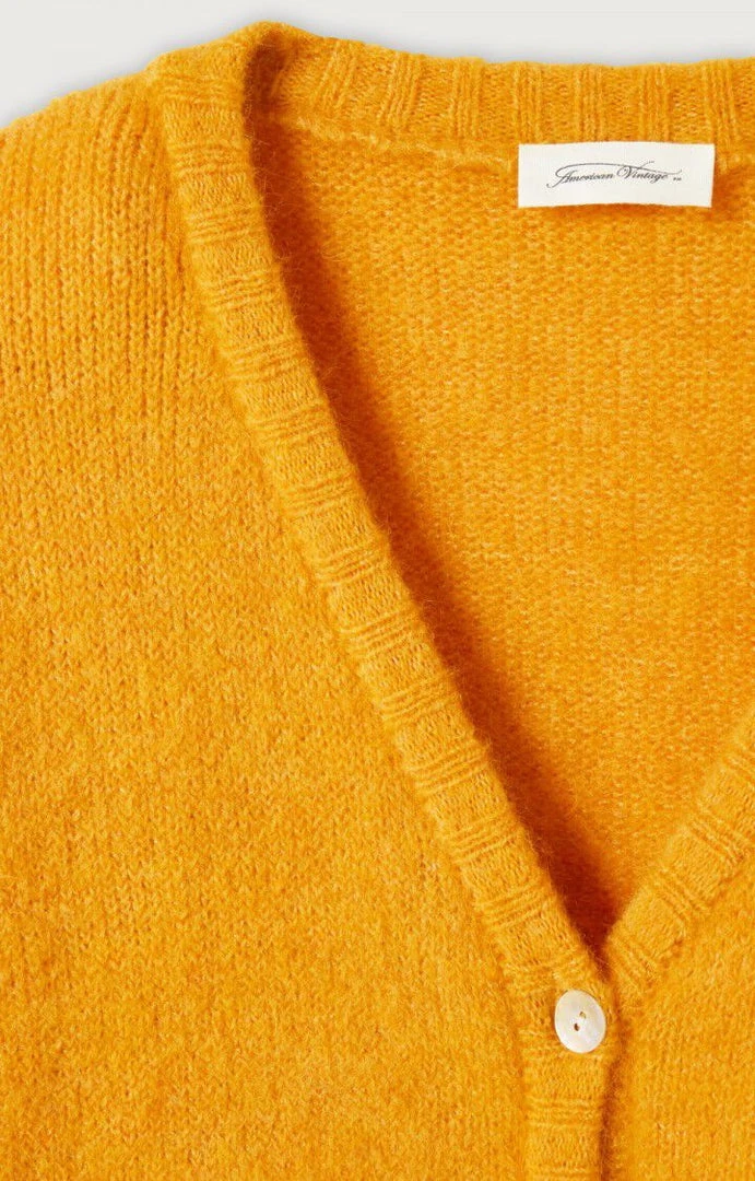 American Vintage orange ‘East 19G’ knit cardigan featuring a v-neckline, front button fastenings, long sleeves with turned up cuffs and ribbed hems. Item fits true to size.Â