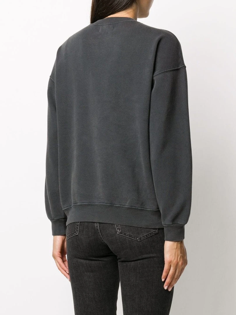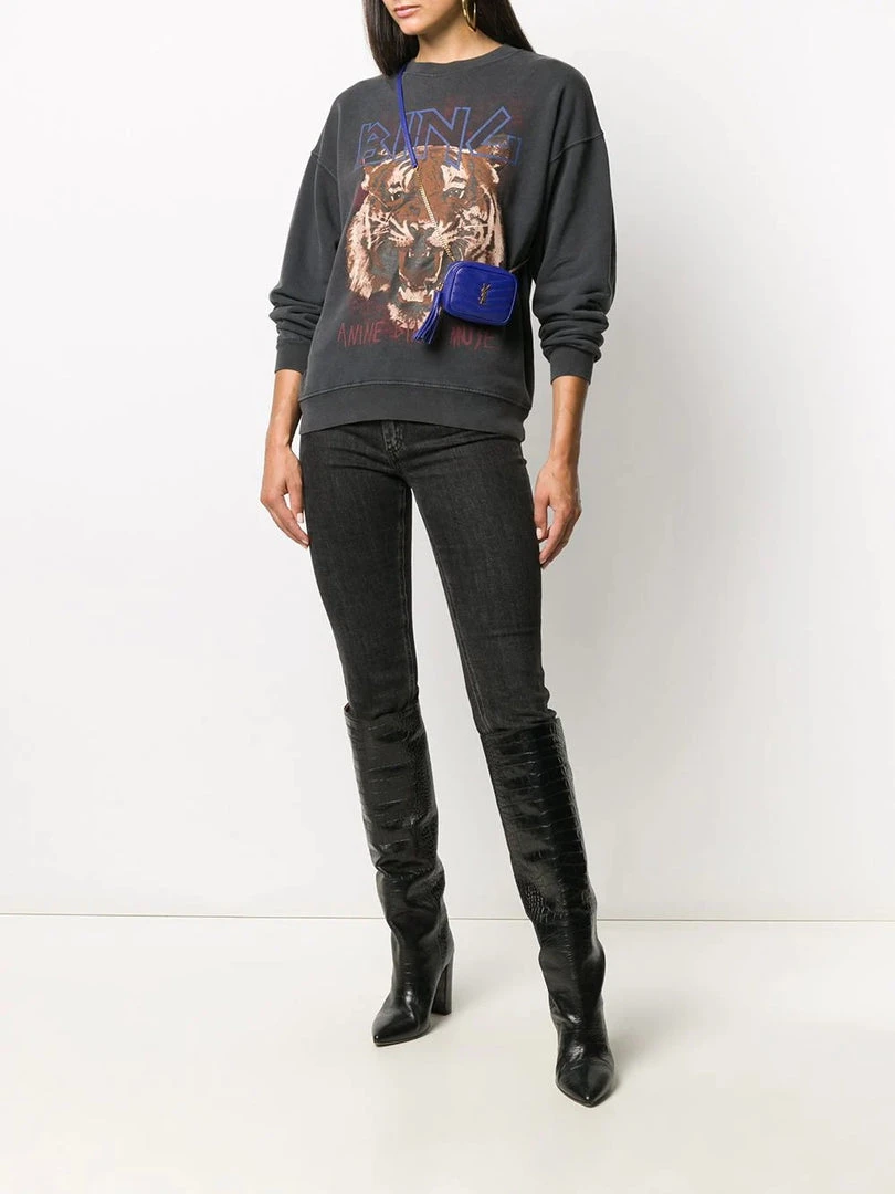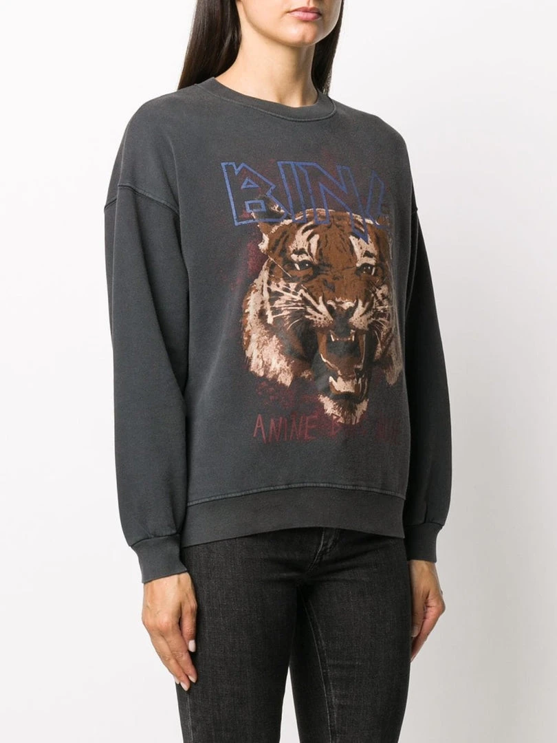 Anine Bing faded black ‘Tiger Graphic Logo Sweatshirt’ featuring a crewneck, dropped shoulders, long sleeves, a brand logo and tiger graphic design on the front, a straight hemline, a boxy fit and pulls on. Item fits true to size. Model is wearing a size XS.