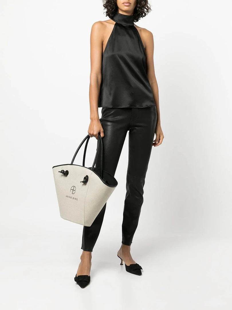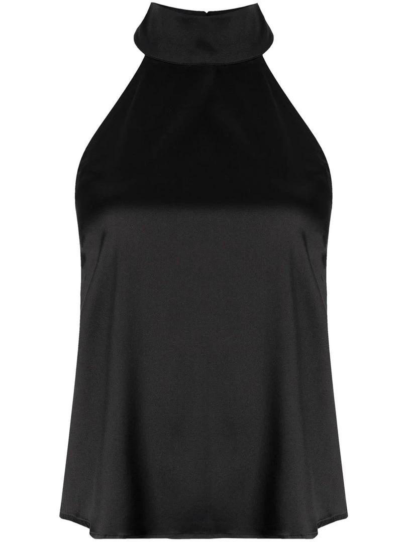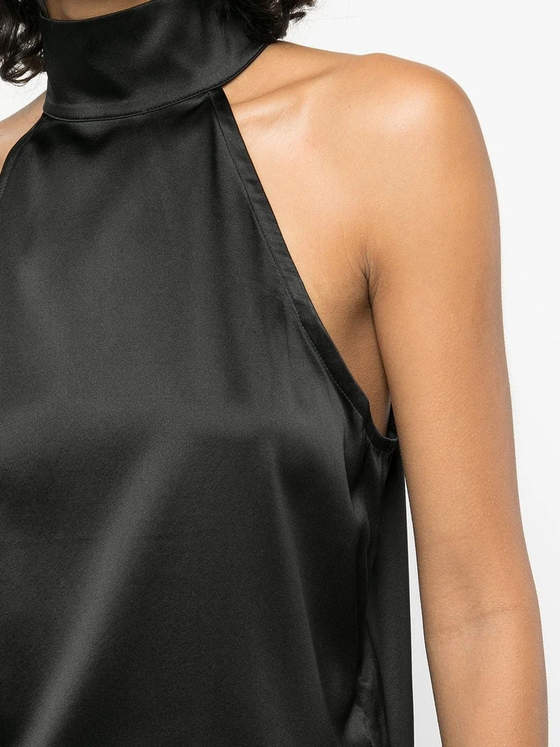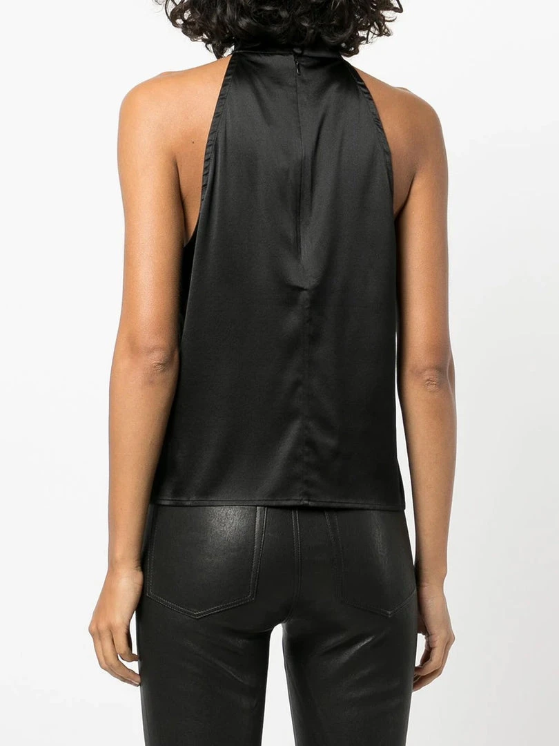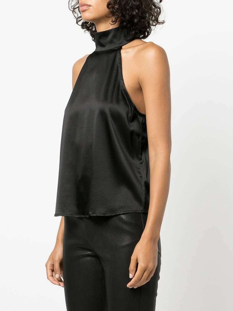 Anine Bing black ‘Sylvia’ high neck top featuring a high neckline, back button and zip fastenings, a sleeveless design and a straight hemline. Item fits true to size. Model is wearing a size XS.