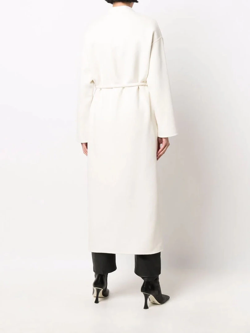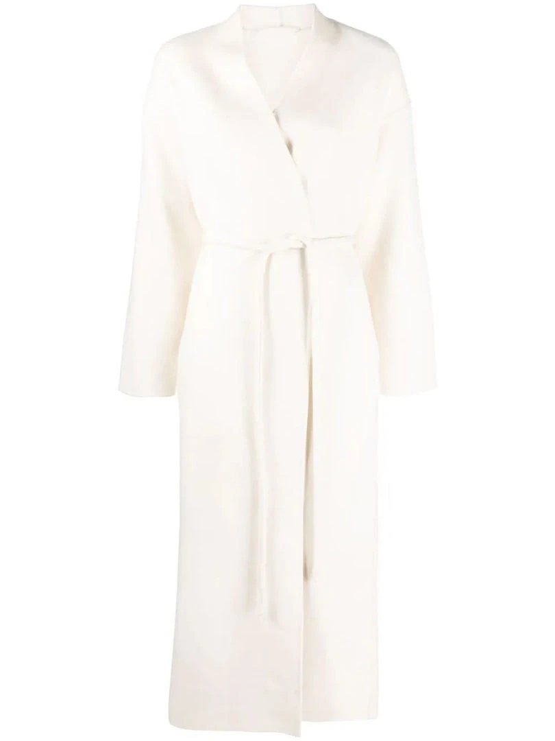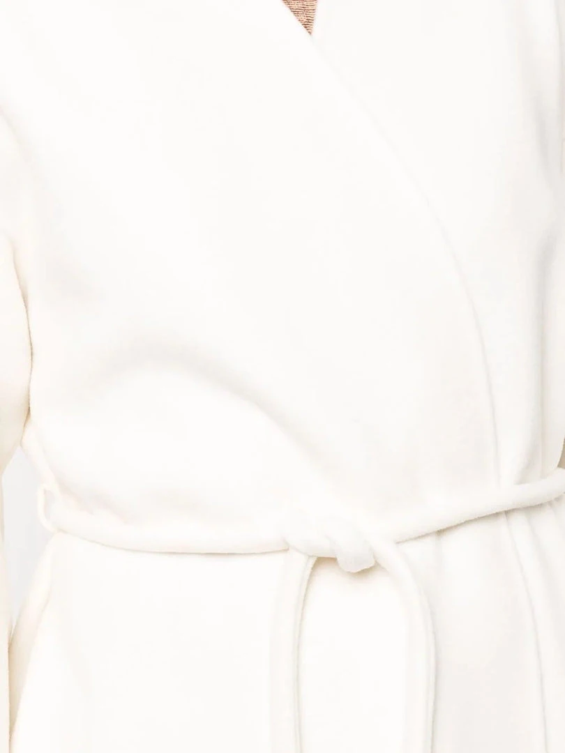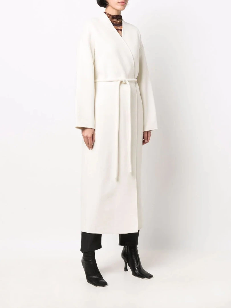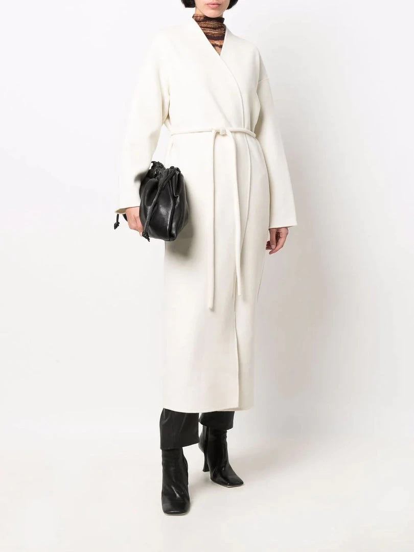 Anine Bing cream ‘Hunter’ coat featuring a wrap style with a tie belted waist, long sleeves, side slip pockets and a midi length. Item fits true to size. Model is wearing a size S.