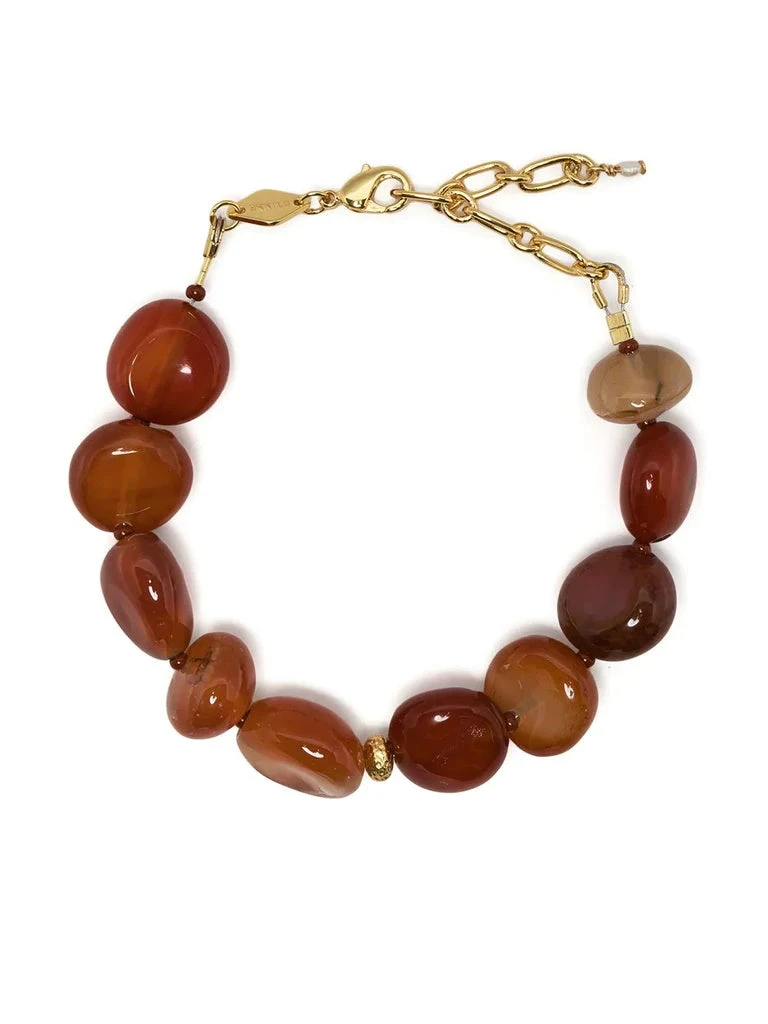 Anni Lu ‘Alba’ bracelet featuring burnt orange toned glass beads, natural agate stones and a freshwater rice pearl, a lobster clasp fastening and an adjustable chain from 16cm to 20cm. Made in Denmark.