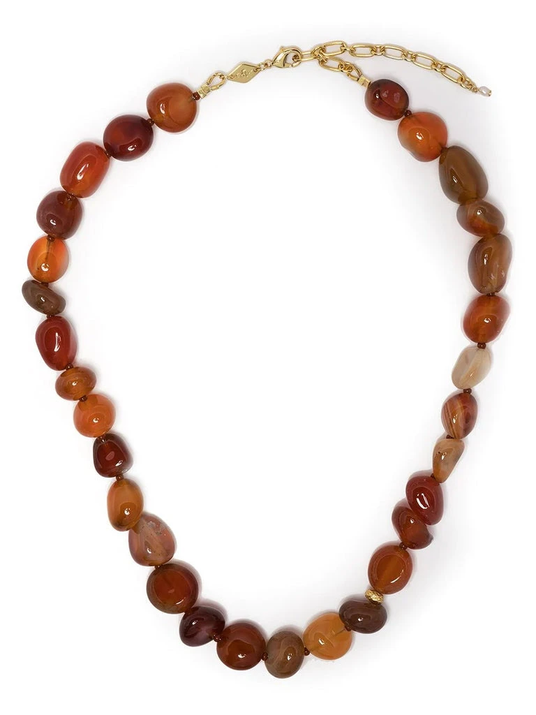 Anni Lu ‘Alba’ necklace featuring burnt orange toned glass beads, natural agate stones and a freshwater rice pearl, a lobster clasp fastening and an adjustable chain from 37cm to 43cm. Made in Denmark.