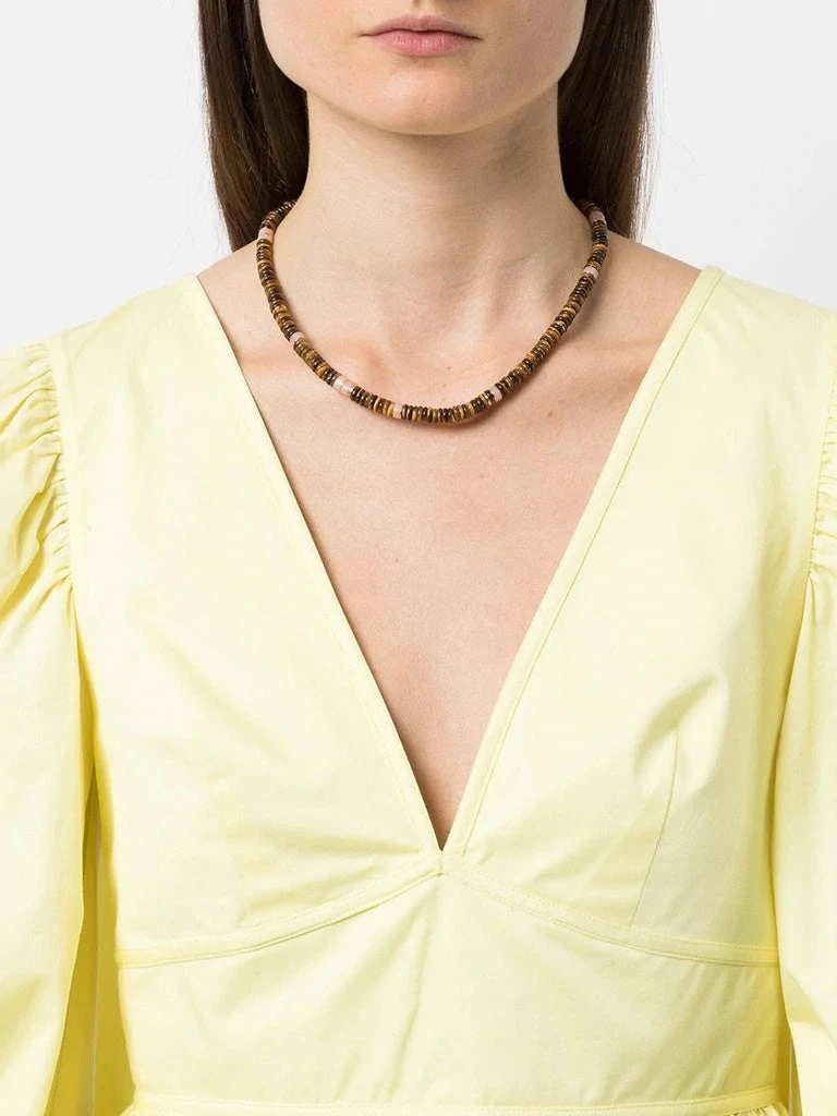 Anni Lu brown ‘Eye Of The Tiger Necklace’ featuring tigereye and pink opal discs, a freshwater rice pearl, a lobster clasp fastening and an adjustable chain from 40cm to 46cm. Made in Denmark.