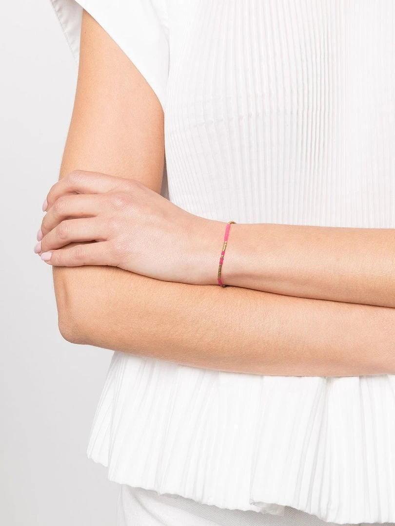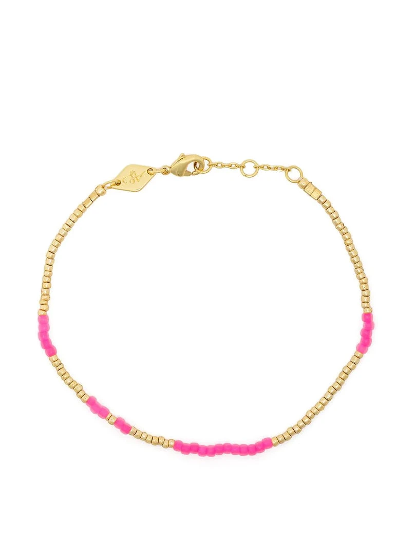 Anni Lu ‘Asym 22’ beaded bracelet featuring a gold and pink coloured bead design and an adjustable clasp closure. Length is 15.5cm to 18cm. Made in Denmark.