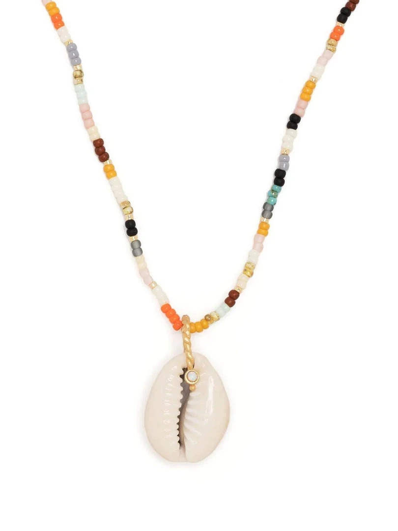 Anni Lu ‘Shelly Eldorado’ necklace featuring Glass Beads, Cowry Shell, Immitation Opal Cabochon and Cultured Freshwater Pearl detailing, gold tone hardware and an adjustable lobster clasp fastening from 41 – 44cm. Made in Denmark.