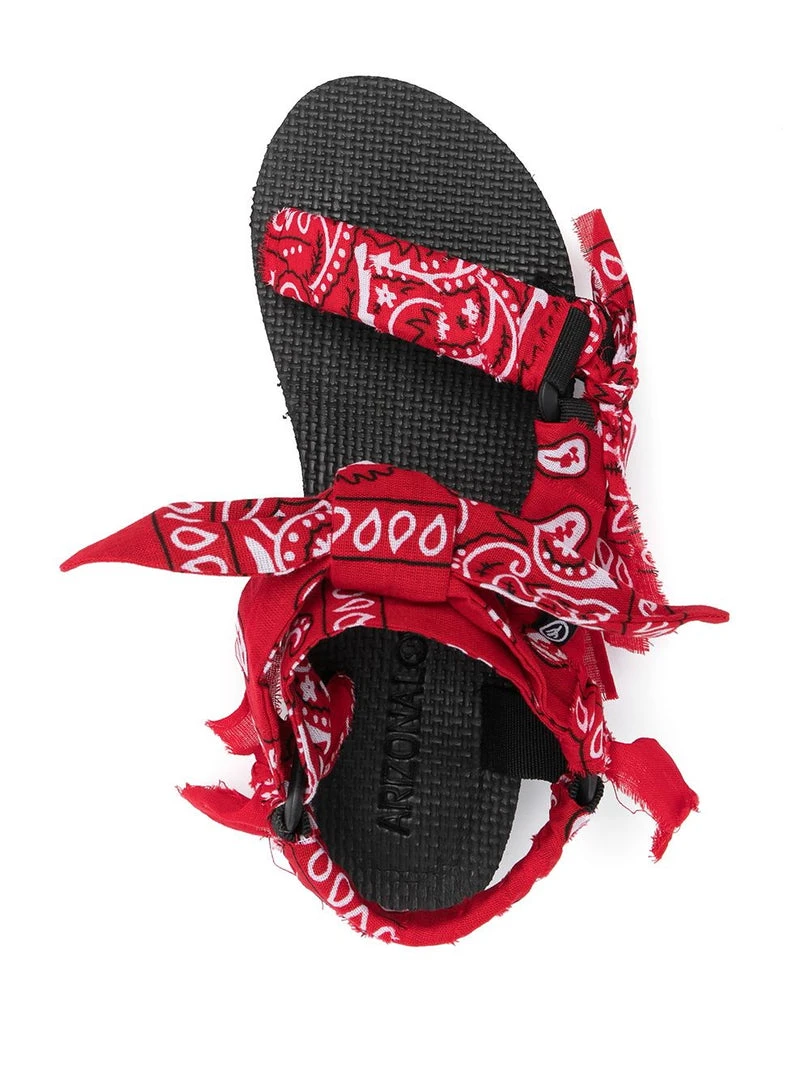 Arizona Love red ‘Trekky Chou’ bandana sandals featuring an open toe, a strapped design, a wrap tie ankle fastening, frayed bandana details and a flat rubber sole. Item is a small size, we recommend to go a size up. Italian Sizing. Made in France.