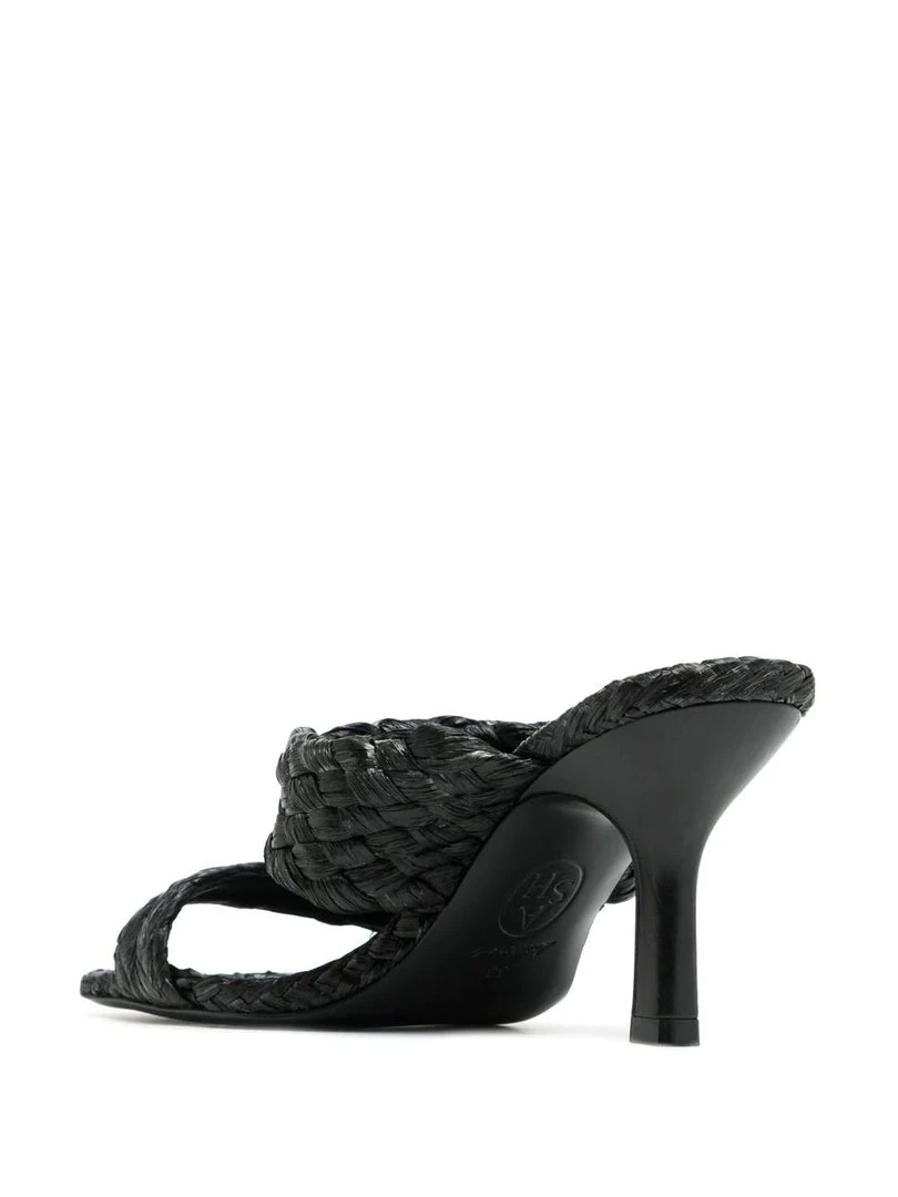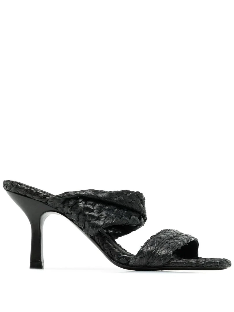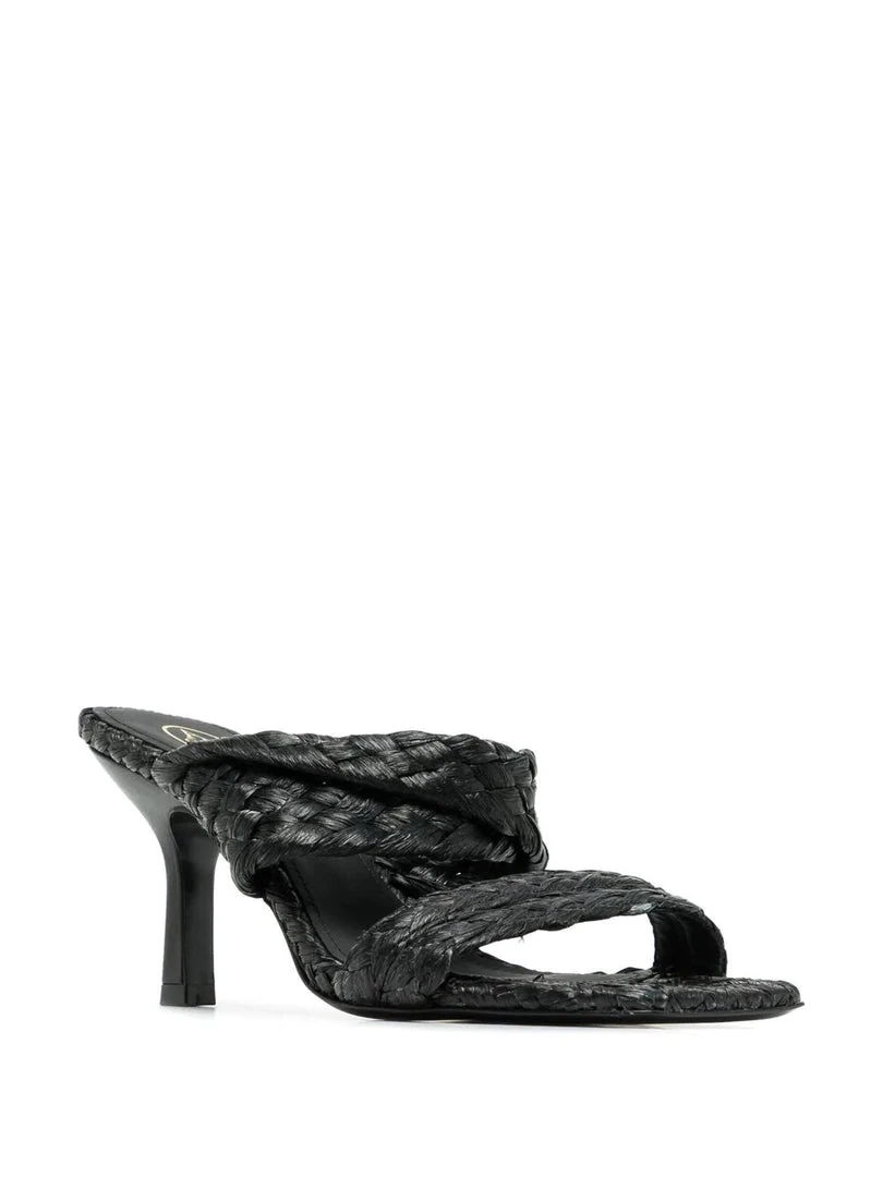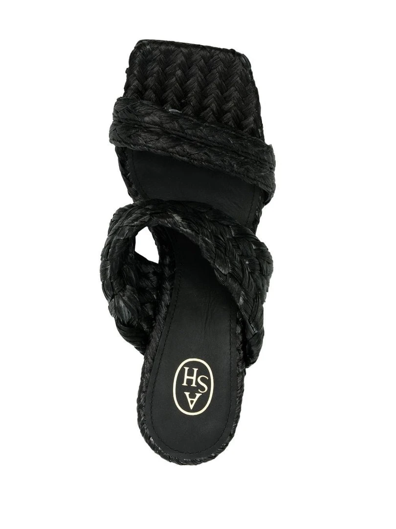 Ash black ‘Malibu’ heels featuring an open toe, a double raffia strapped design, a branded insole and a slip on style. Made in Italy. Italian Sizing. Item fits true to size.