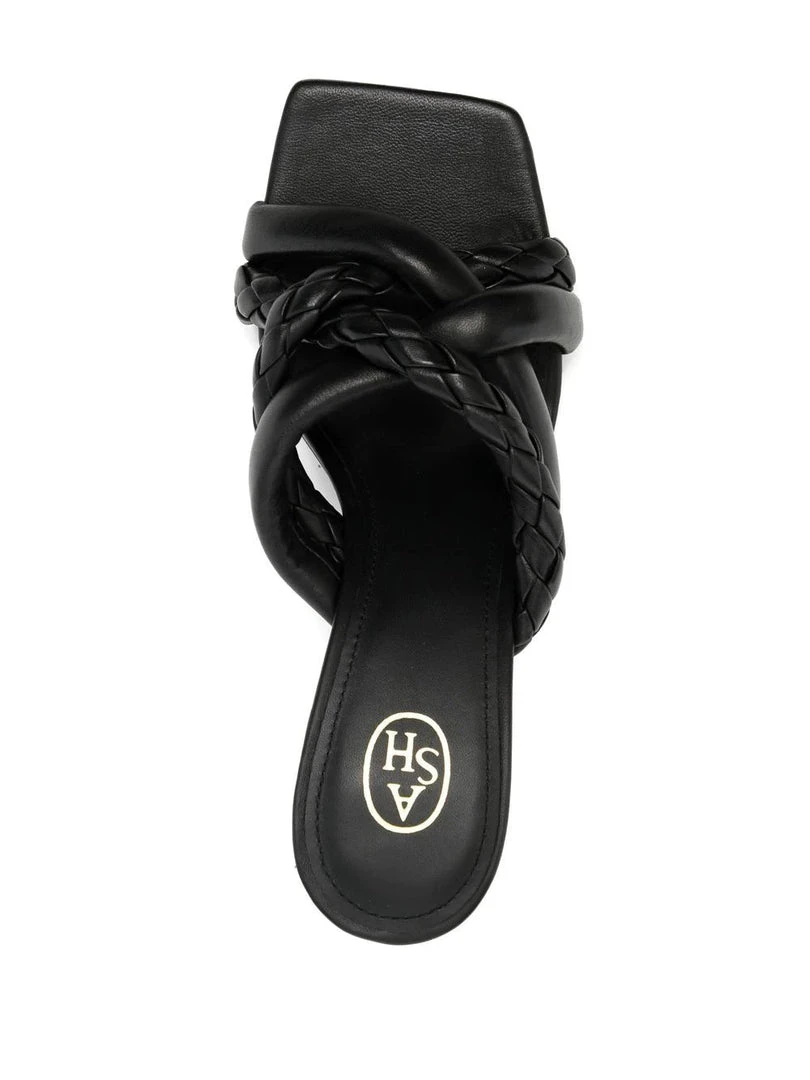 ASH black ‘Minabis’ heeled mules featuring an open toe, a interwoven braided design, a branded insole and a slip on style. Item fits true to size. Italian Sizing.