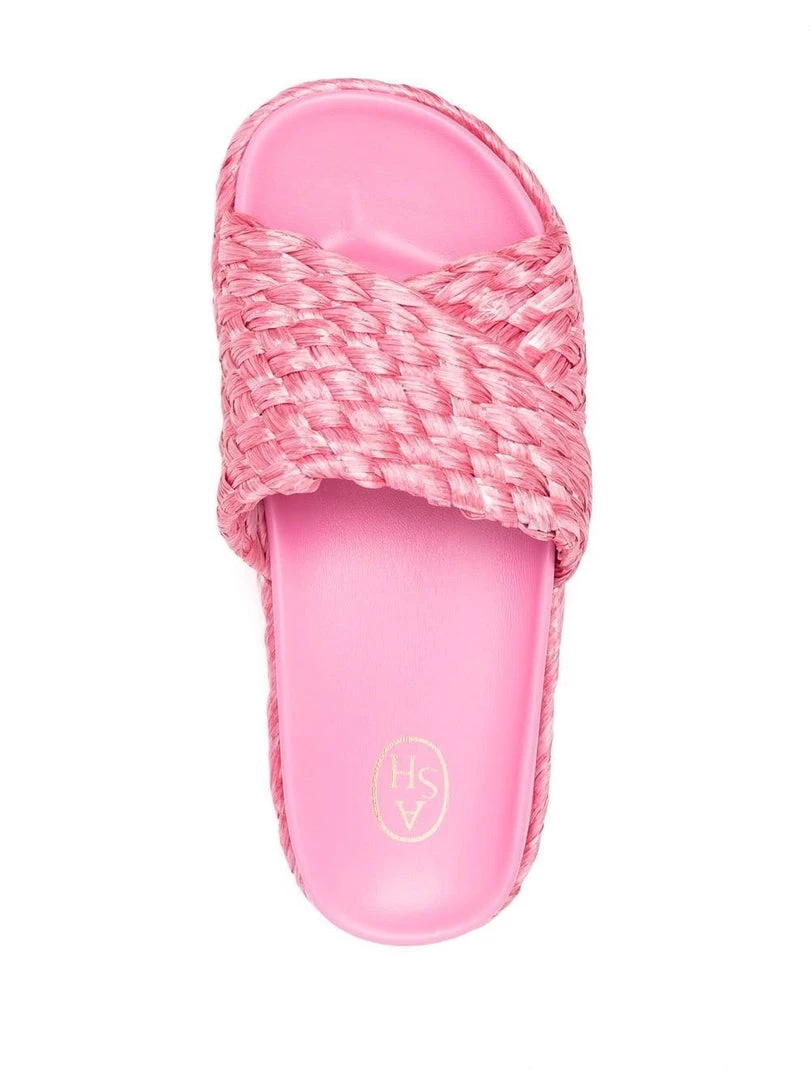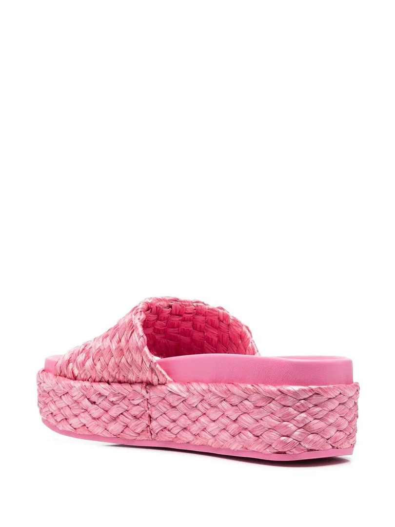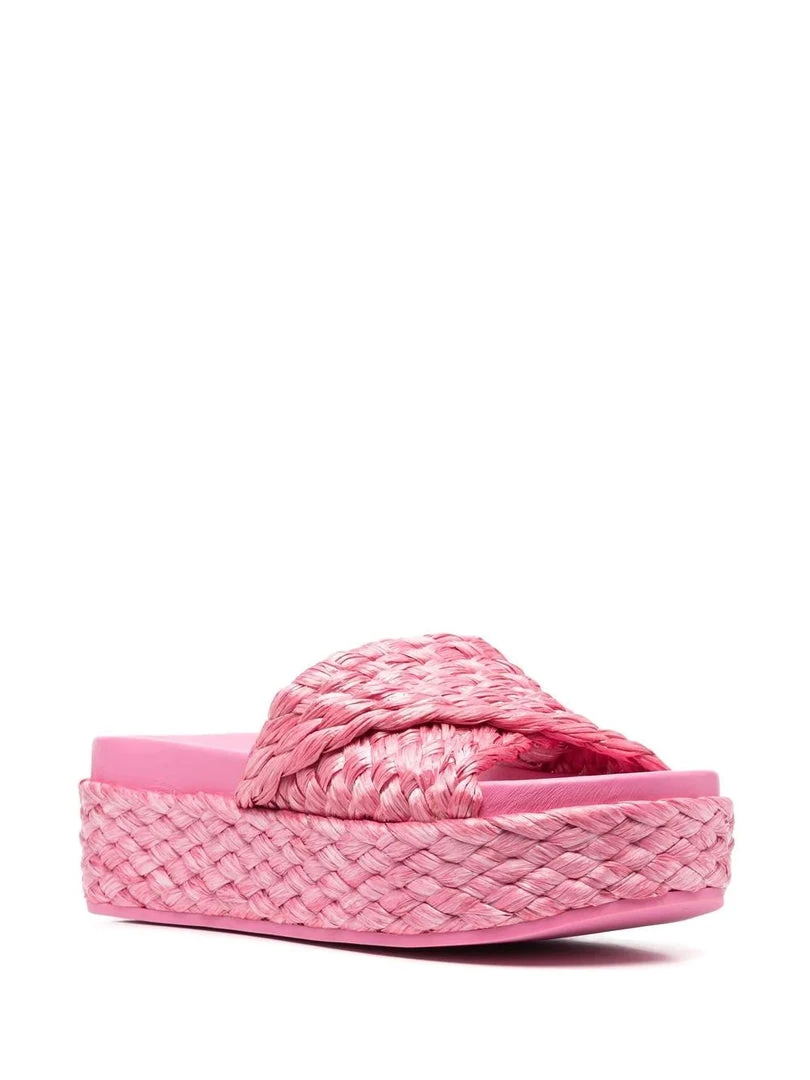 Ash pink ‘Zen’ platform slides featuring an open toe, a crossover strap, a branded insole, a slip on style, a 4.5cm sole height and a raffia design. Made in Italy. Italian Sizing. Item fits true to size.