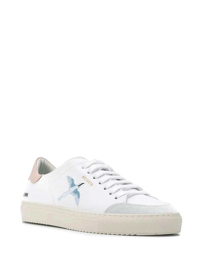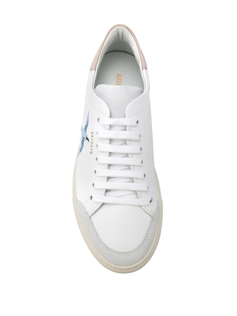 Axel Arigato white ‘Blue Bird Embroidered Trainers’ featuring a round toe with a light grey suede tip, a lace up fastening with a light grey suede tongue, a gold embossed logo detail to the side, a contrasting pink heel counter and a branded insole. Made in Portugal. Item fits true to size. European Sizing.