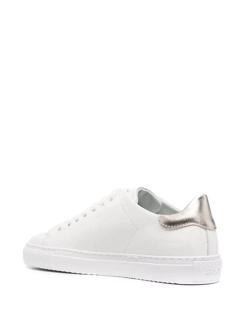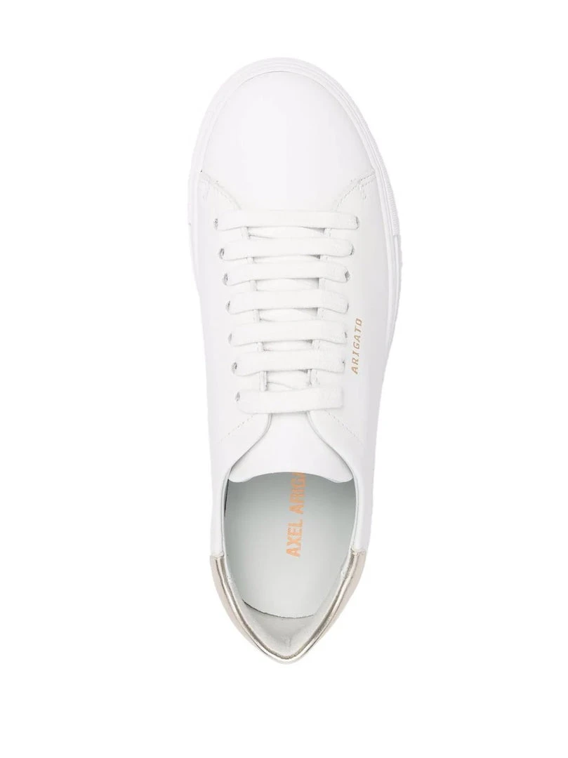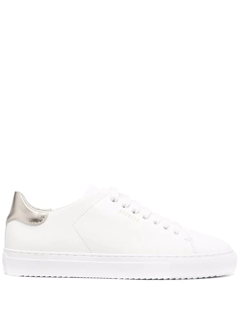 Axel Arigato white ‘Gold Heel Counter Trainers’ featuring a round toe, a lace up fastening, a gold embossed logo detail to the side and a branded insole. Made in Portugal. Item fits true to size. European Sizing.