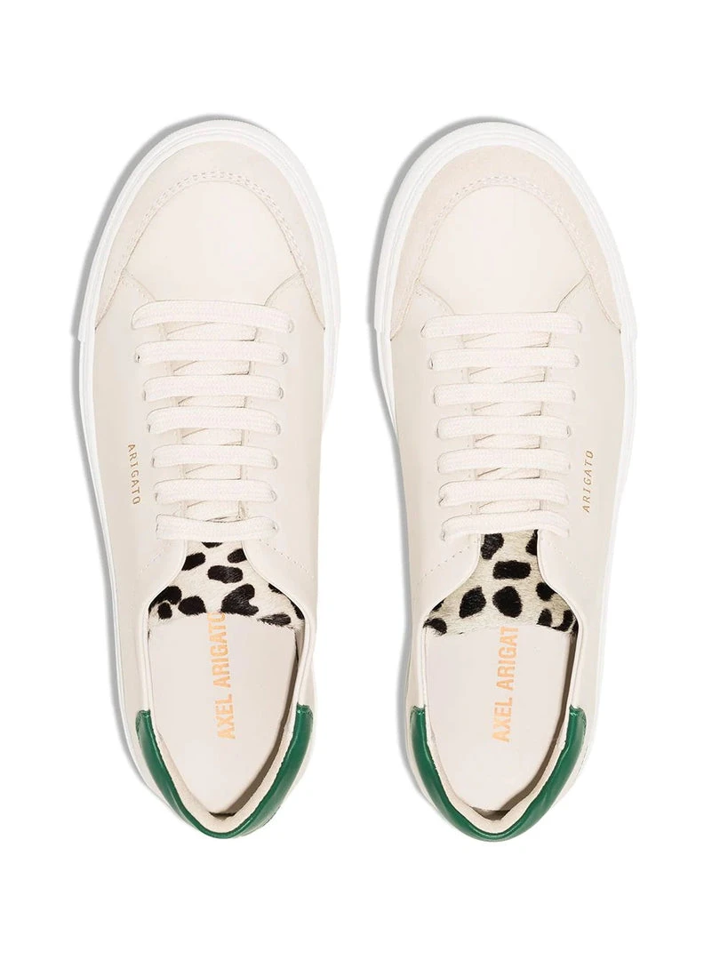 Axel Arigato cream ‘Green Heel Counter Trainers’ featuring a round toe, a lace up fastening with neon orange tips, a contrasting calf hair cow detailed tongue, a gold embossed logo detail to the side and a branded insole. Made in Portugal. Item fits true to size. European Sizing.