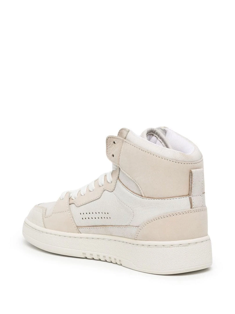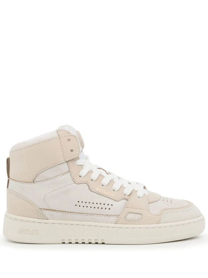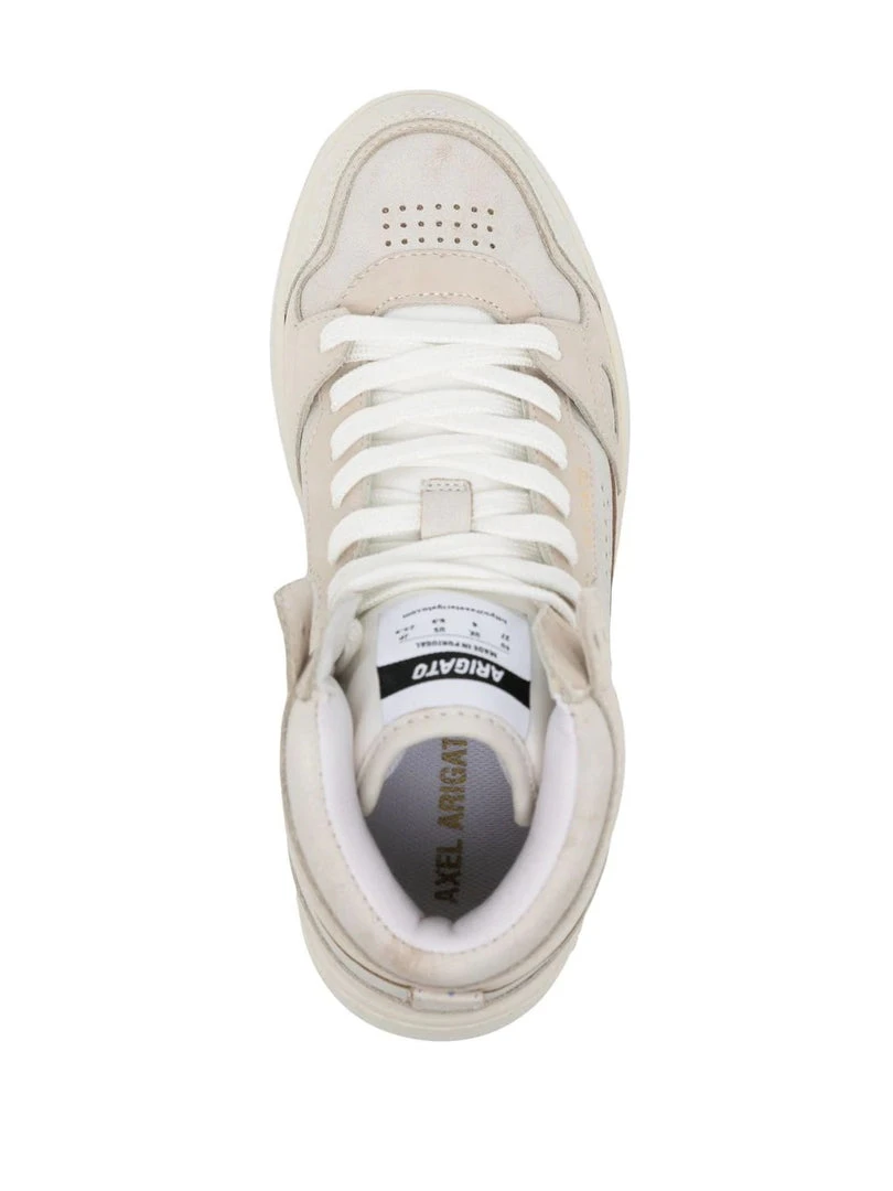 Axel Arigato beige ‘High Top Trainers’ featuring a round toe, a lace up fastening, a branded tongue and sole, a gold embossed logo detail to the side, a pull tab at the rear and perforated areas. Made in Portugal. Item fits true to size. European Sizing.