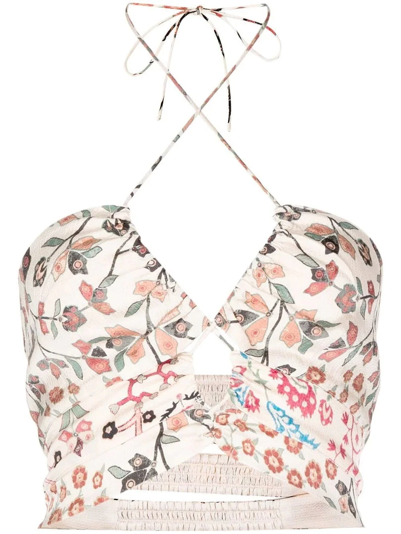Ba&sh ecru ‘Giulia’ top featuring a front tie detail with a keyhole design, a multicoloured floral print, cut out details with gathered back straps and a sleeveless style. Item fits true to size. Model is wearing a size 0.