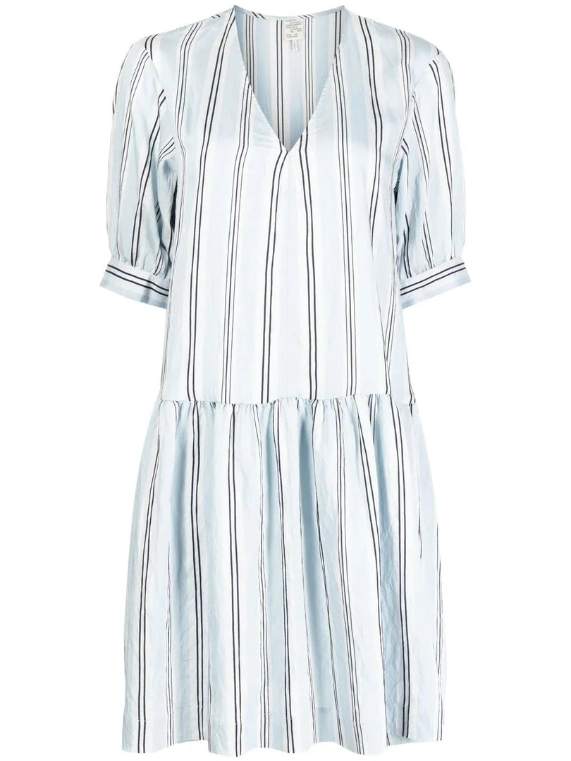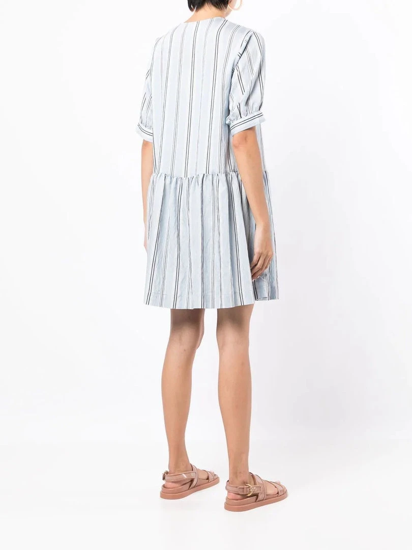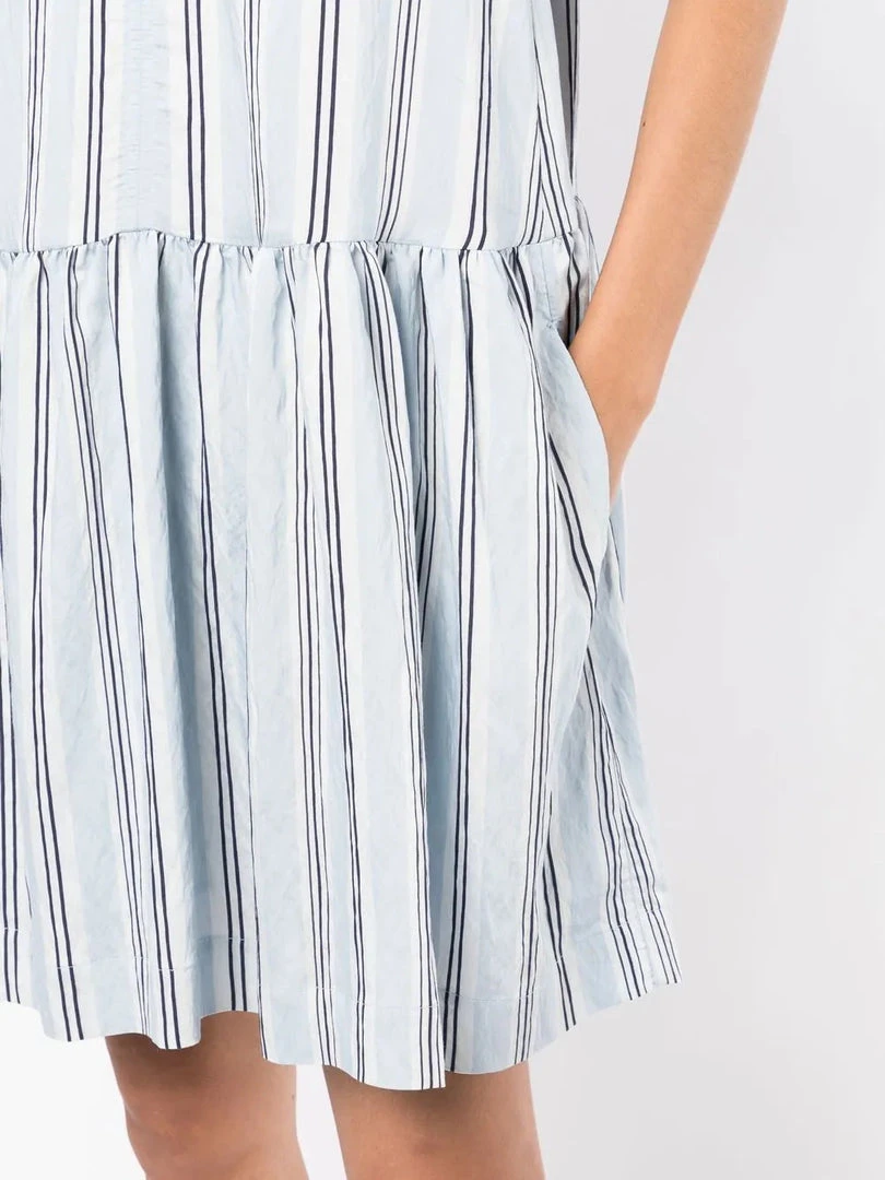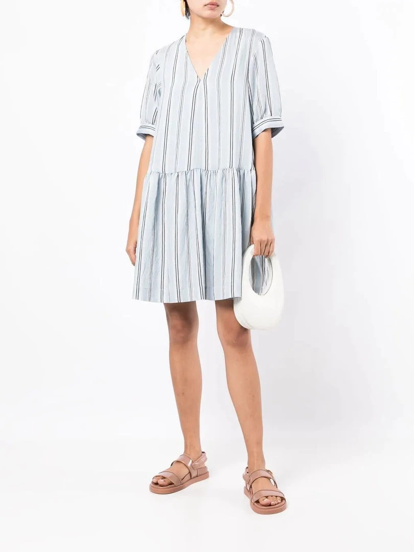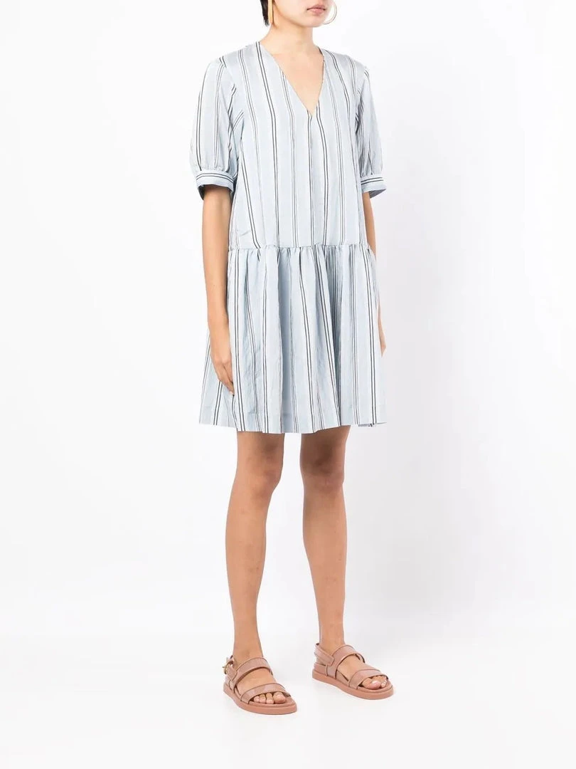 Baum Und Pferdgarten light blue ‘Andromeda’ mini dress featuring a v-neckline, short sleeves, side slip pockets, a striped print, pleat details, an oversized fit and pulls on. Model is wearing a size 34 DE/DK.