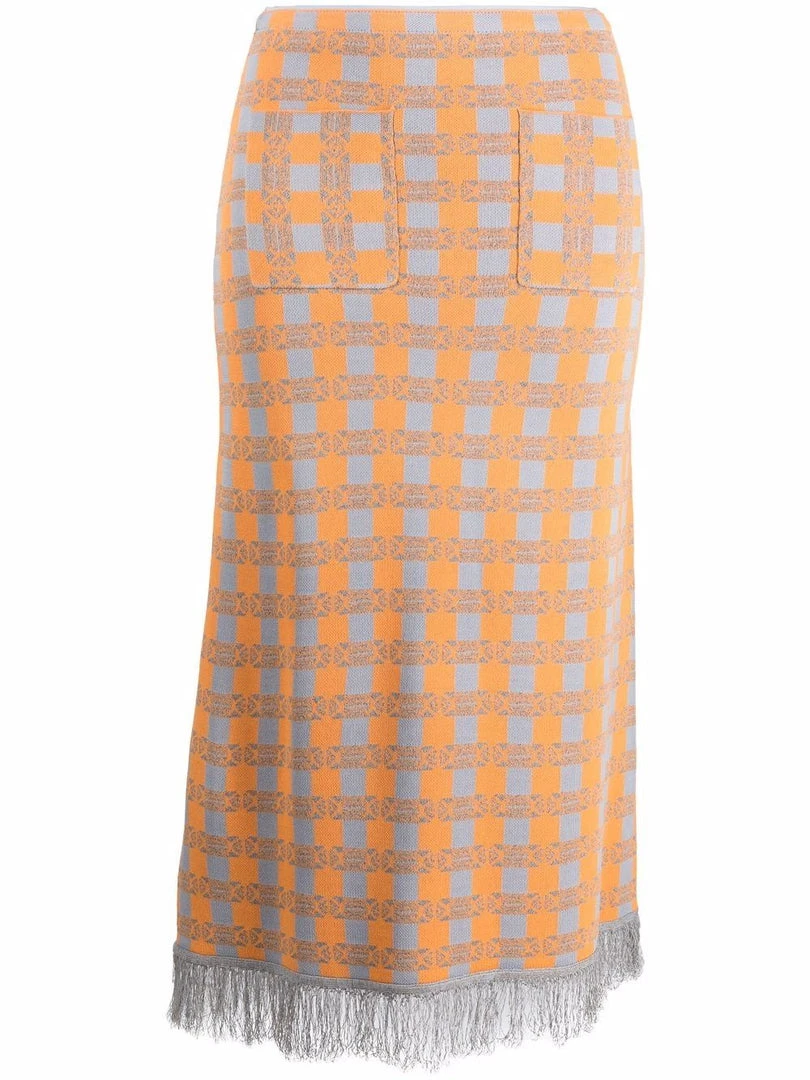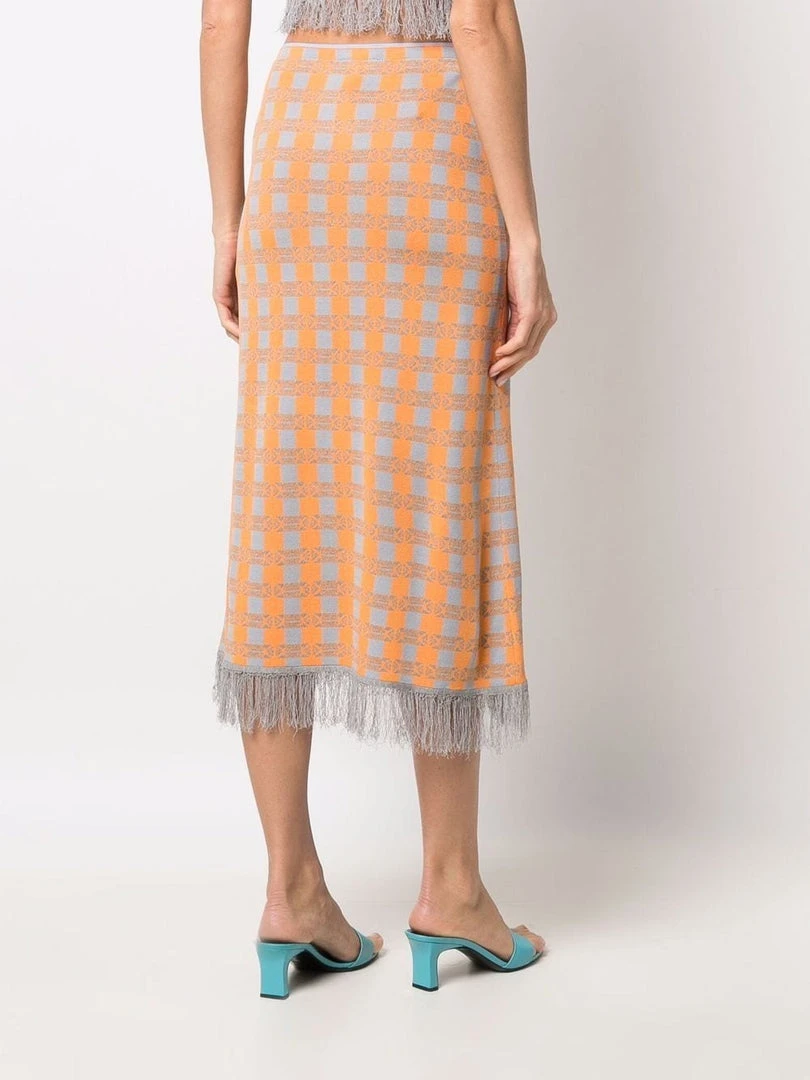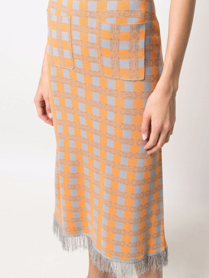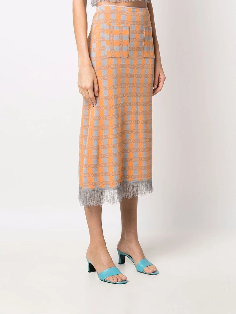 Baum Und Pferdgarten knitted orange and grey ‘Callis’ midi skirt featuring a high waist fit, an elasticated waistband, a checked design, two front patch pockets, a tasselled hem and a pull on style. Item fits true to size. Model is wearing a size XS. Â