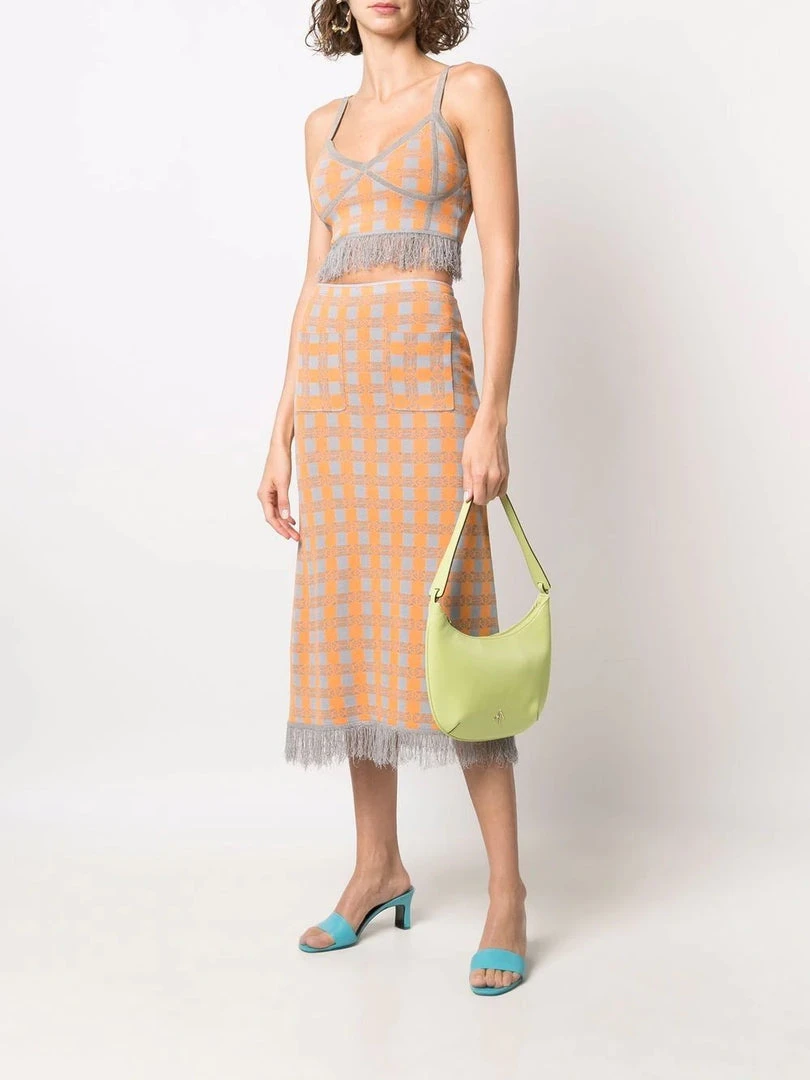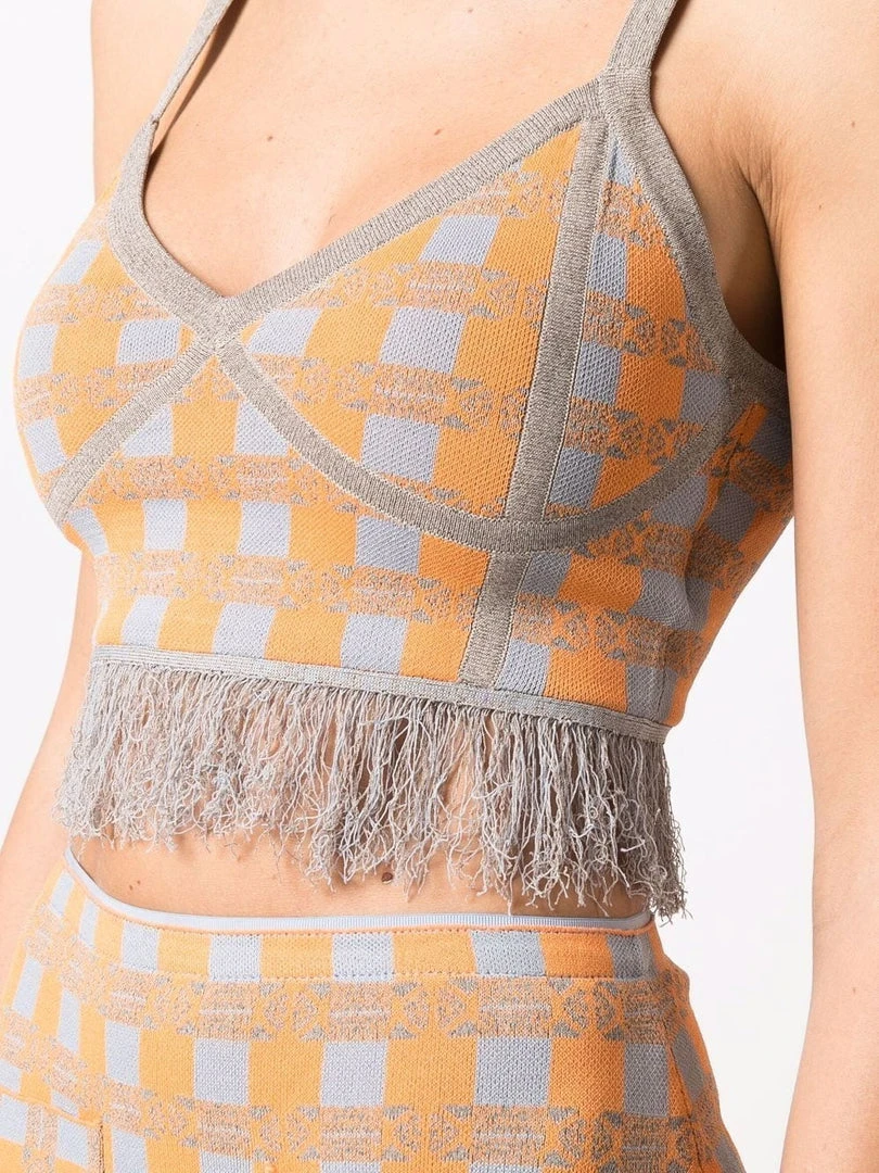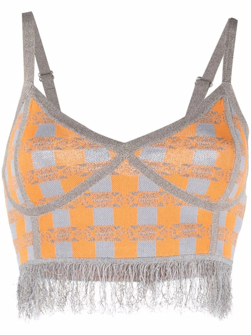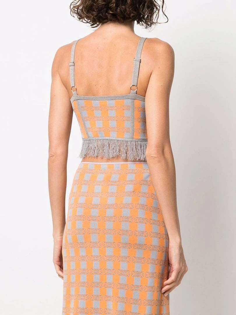 Baum Und Pferdgarten knitted orange and grey ‘Cypres’ top featuring a v-neckline, adjustable thin straps, a checked design, a cropped fit, a tassled hem and a pull on style. Item fits true to size. Model is wearing a size XS. Â