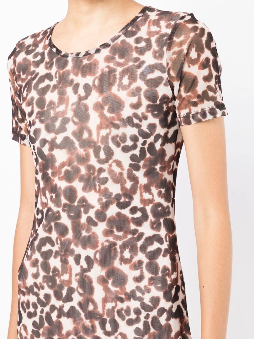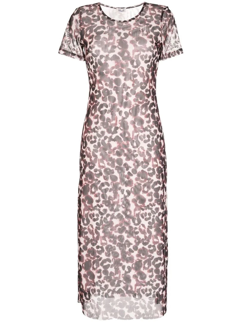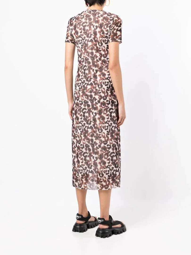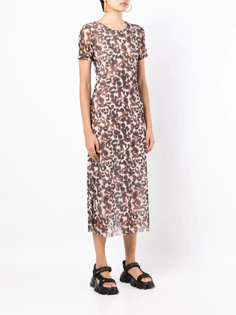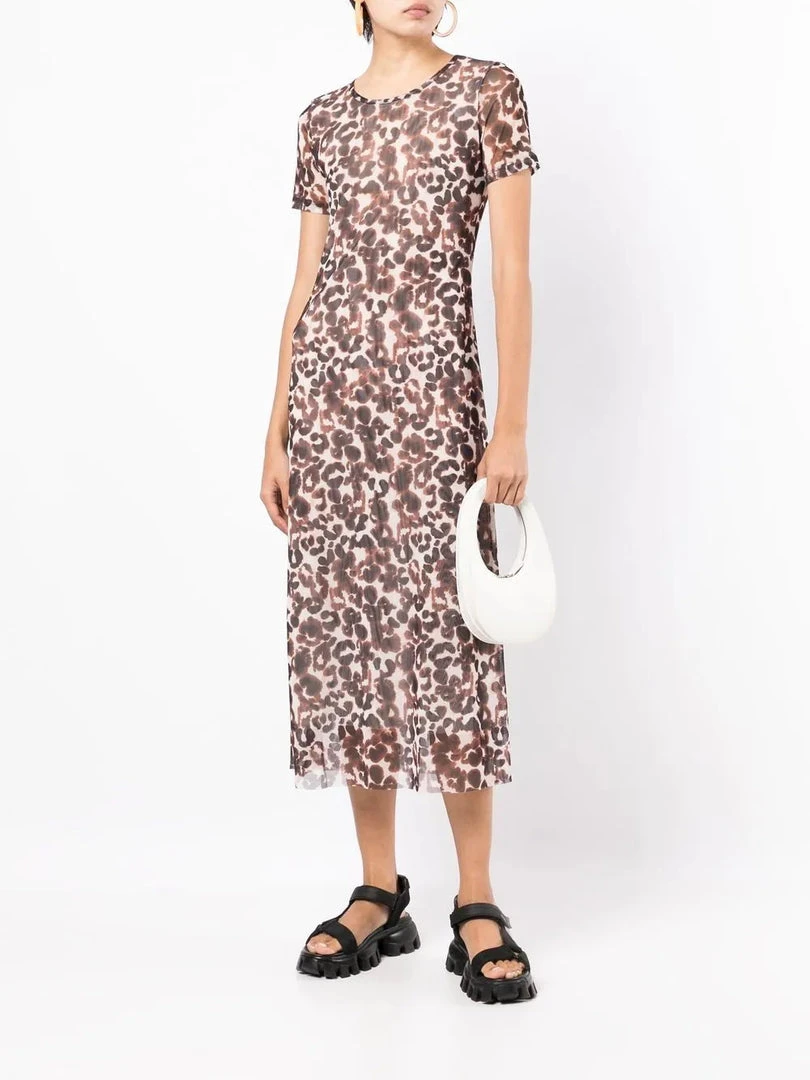 Baum Und Pferdgarten brown ‘Jolea’ mesh midi dress featuring a round neck, short sleeves, a floral watercolour print and a pull on style. Item fits true to size. Model is wearing a size S.Â