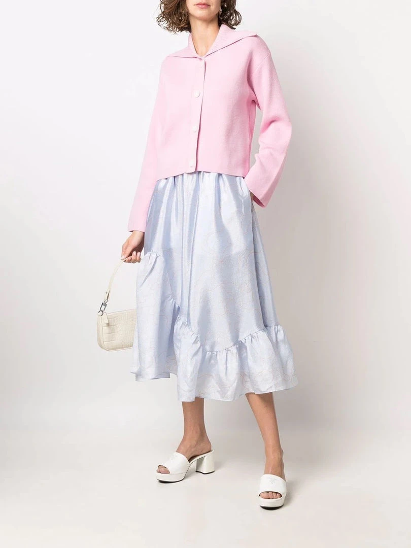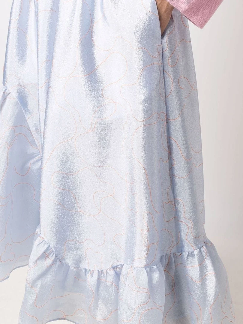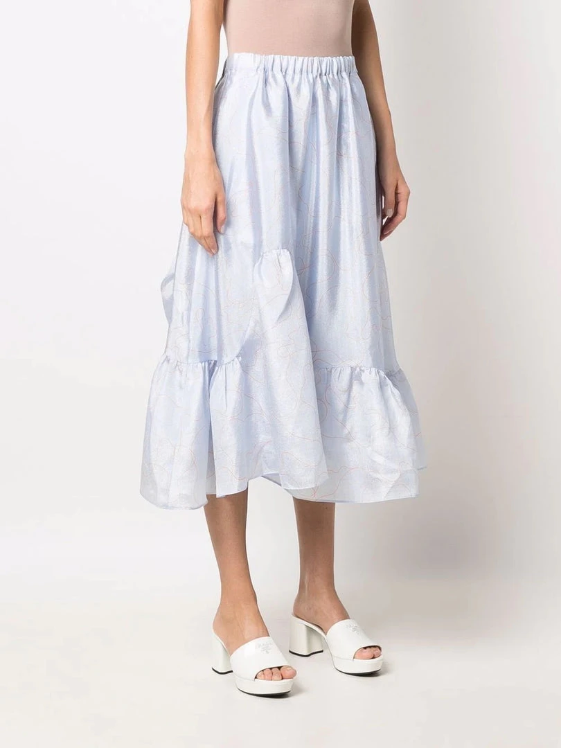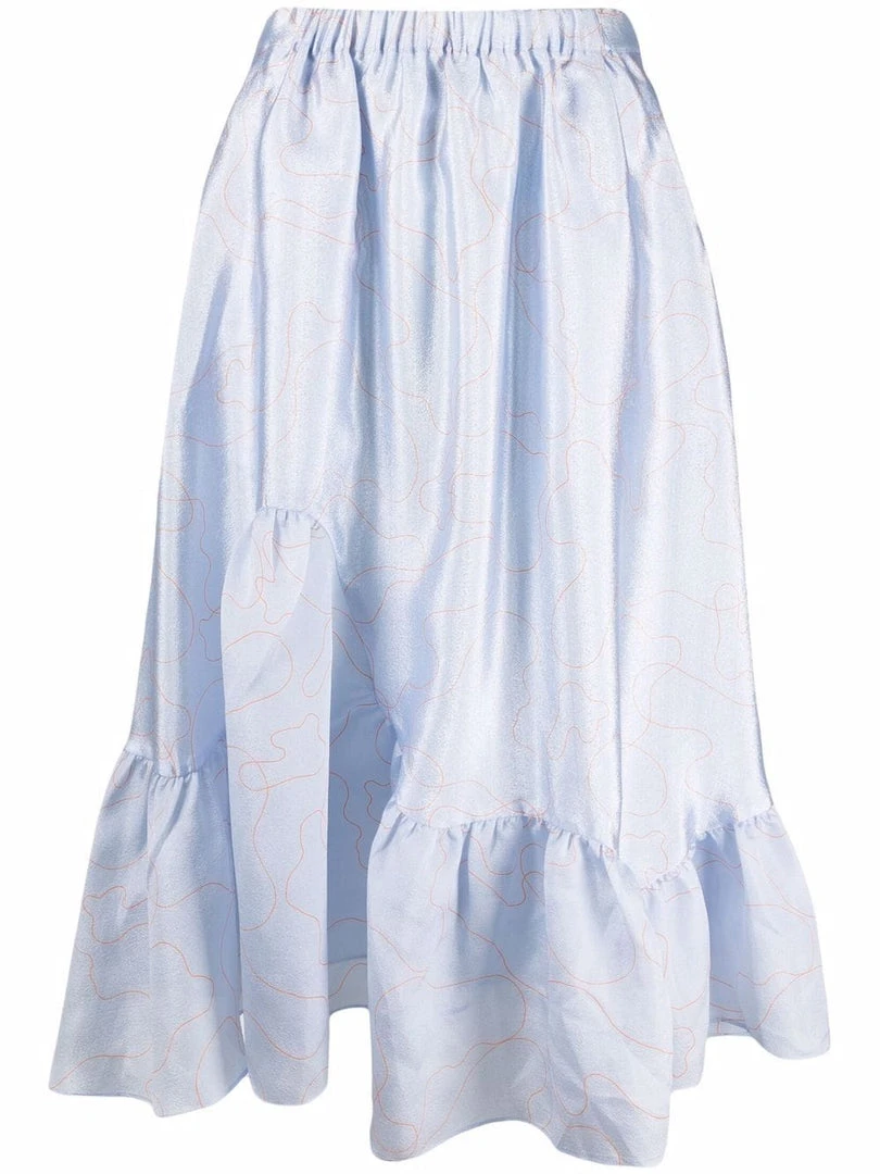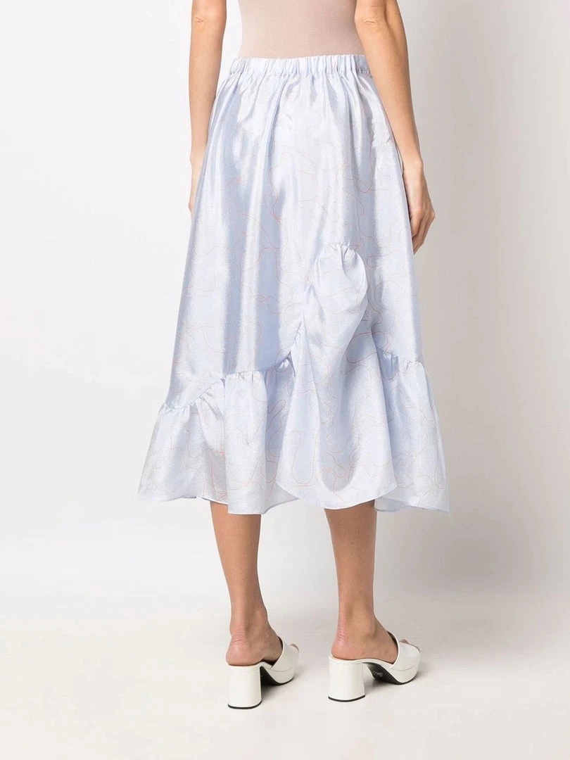Baum Und Pferdgarten light blue ‘Stone’ skirt featuring a high waist fit, an elasticated waistband, an asymmetric ruffled design, an abstract linear orange print, side slip pockets, a midi length and a pull on style. Item fits true to size. Model is wearing a size 36 DE/DK. Â