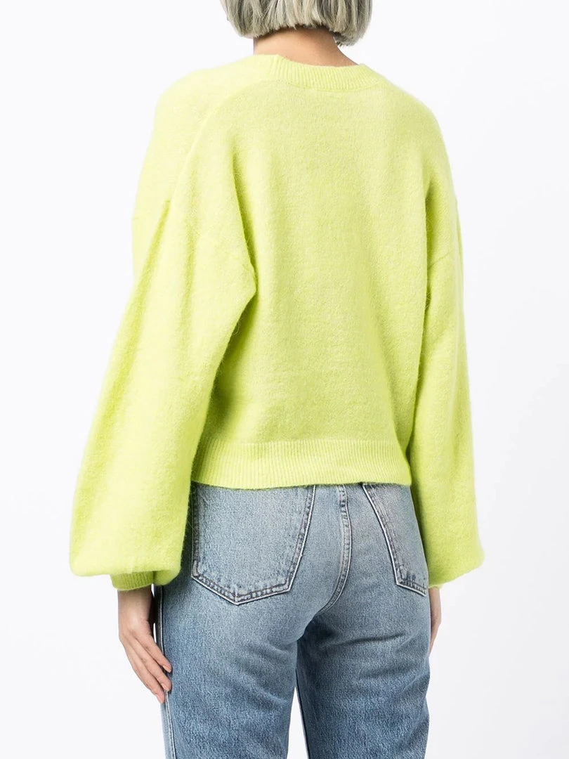 Baum und Pferdgarten lime ‘Chasmeen’ puff sleeve cardigan featuring a V-neckline, front button fastenings, long puff sleeves, ribbed hem details and a straight hemline. Item fits true to size. Model is wearing a size XS.Â
