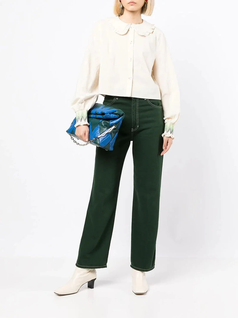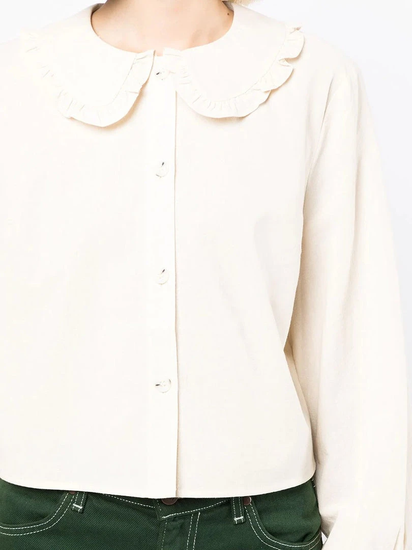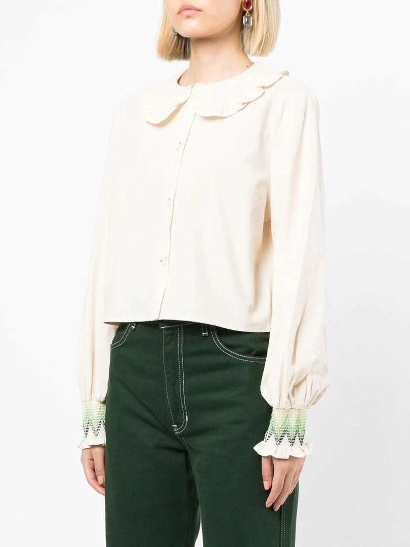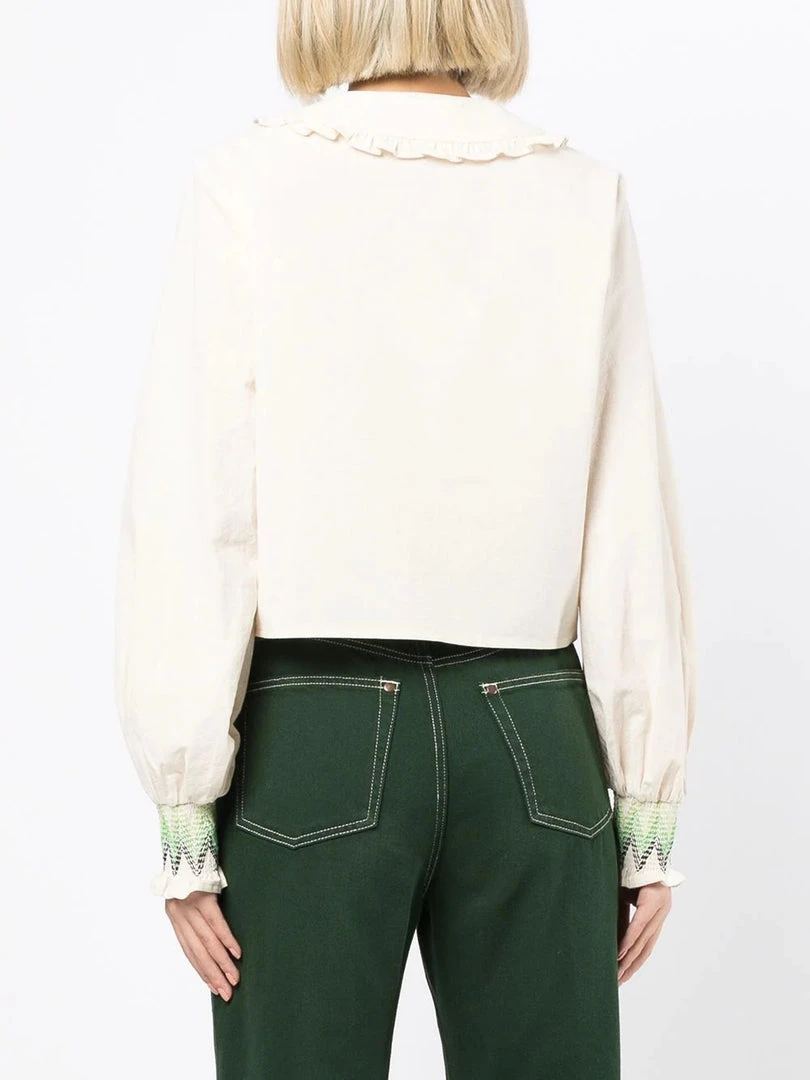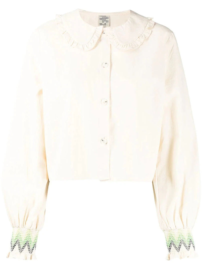 Baum und Pferdgarten ‘Myette’ embroidered sleeve shirt featuring a ruffled collar, front button fastenings, long sleeves with elasticated cuffs and zig-zag embroidered details, a straight hemline and a boxy shape. Item fits true to size. Model is wearing a size 36 FR.Â