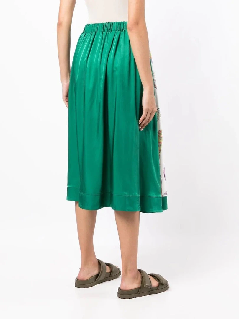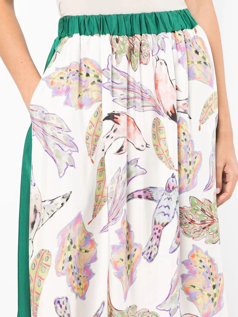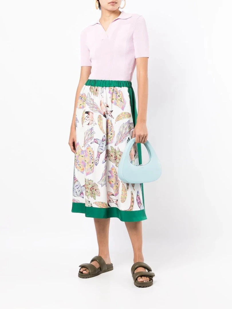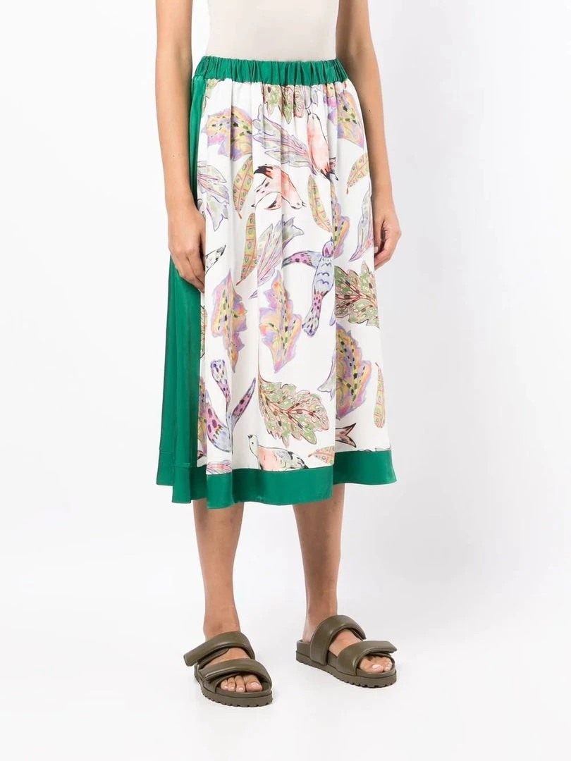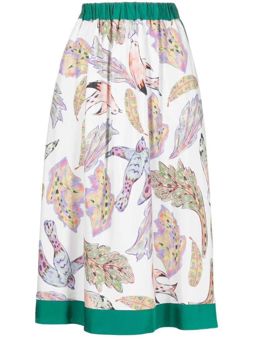 Baum Und Pferdgarten green and white ‘Sady’ midi skirt featuring an elasticated waistband, side slip pockets, a front multicoloured leaf and bird watercolour print and a pull on style. Item fits true to size. Model is wearing a size 36 DE/DK.Â