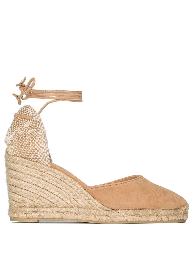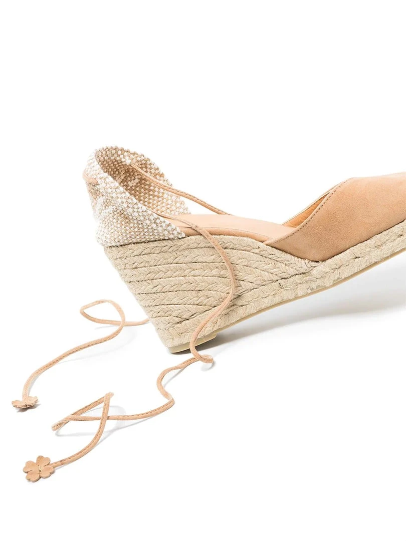 Castaner beige ‘Carina 8 007’ espadrilles featuring a round toe, a branded insole, a small open heel back design, a tie up ankle fastening with clover details and a wedged heel. Â Made in Spain. Item fits true to size. European Sizing.