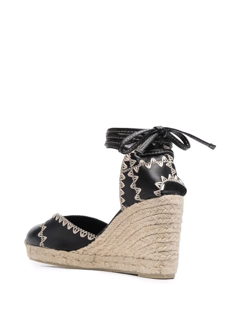 Castaner black ‘Iria’ espadrilles featuring a round toe, an off white contrasting stitched embroidered design, a branded insole, a small open heel back detail, a tie up ankle fastening and a wedged heel. Â Made in Spain. Item fits true to size. European Sizing.