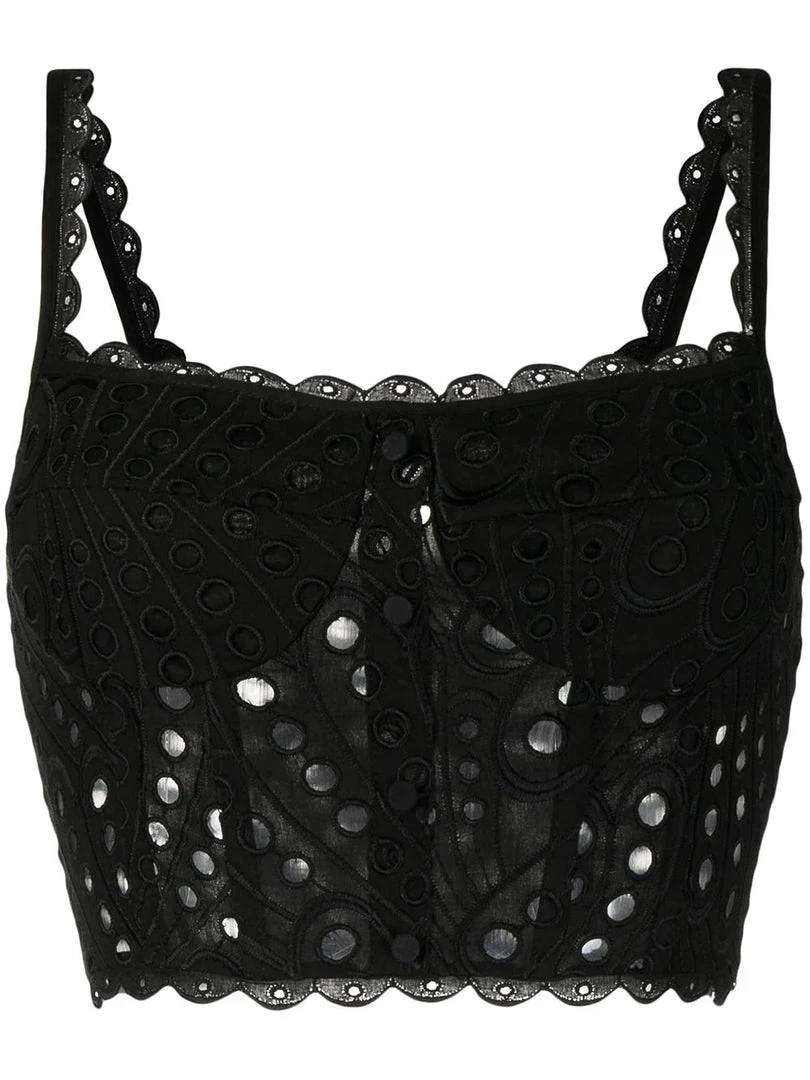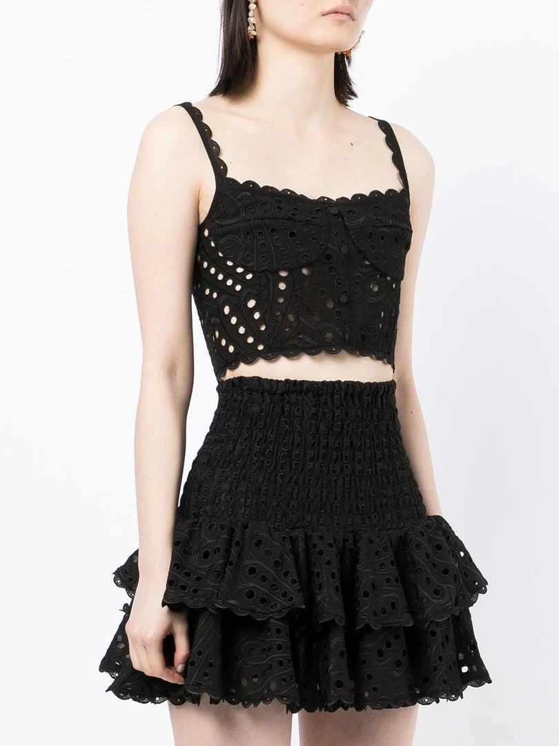 Charo Ruiz Ibiza black ‘Tessa’ crop top featuring thin straps, front button detailing, a concealed side zip fastening, a circular embroidered stitched design, panelled details, an elasticated gathered back, scalloped hems and a pull on style. Item fits true to size. Model is wearing a size S.