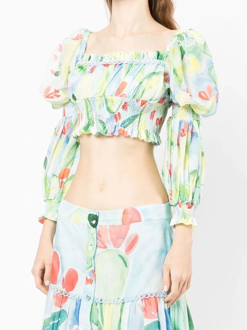 Charo Ruiz Ibiza ‘Brisa’ top featuring a square neckline with front lace trimming, a multicoloured print, elasticated shoulders and cuffs, long puffed sleeves, gathered details, a cropped fit, ruffled hems and a concealed side zip fastening. Item fits true to size. Model is wearing a size S.Â