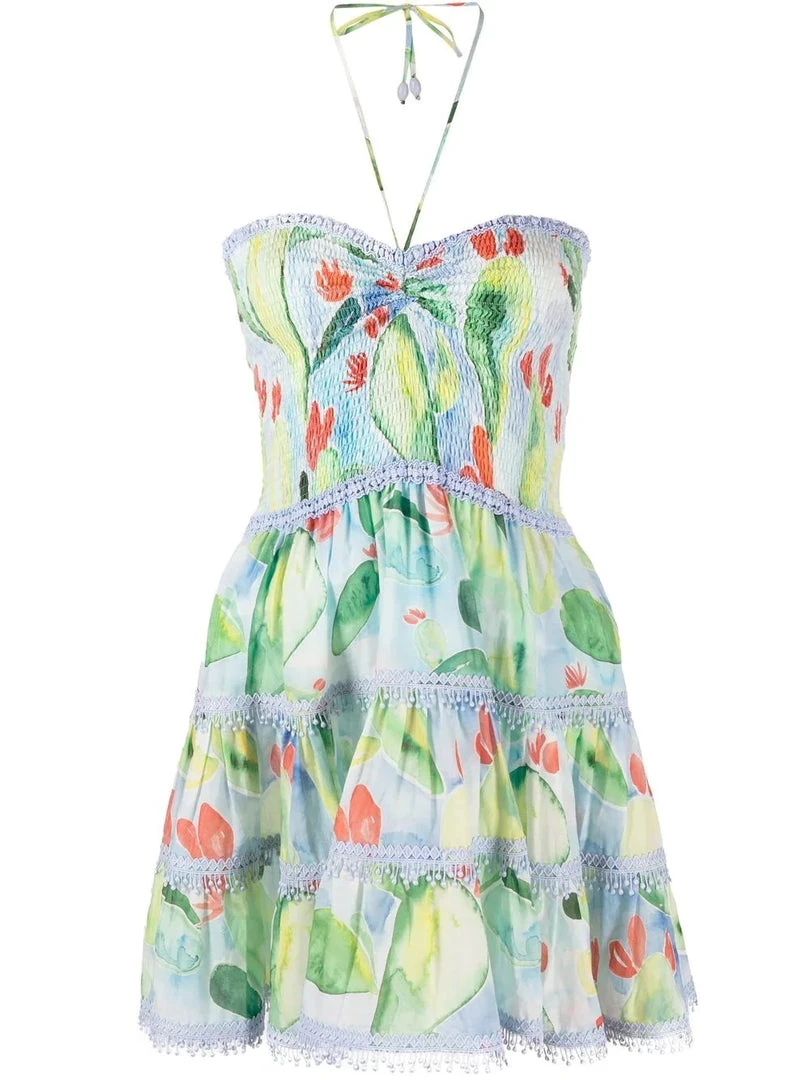Charo Ruiz Ibiza ‘Enya’ mini dress featuring a sleeveless design, a shirred top, a front tie detail or neck fastening, a multicoloured abstract floral print, a tiered skirt with lace embroidered detailing and a pull on style. Item fits true to size. Model is wearing a size S.