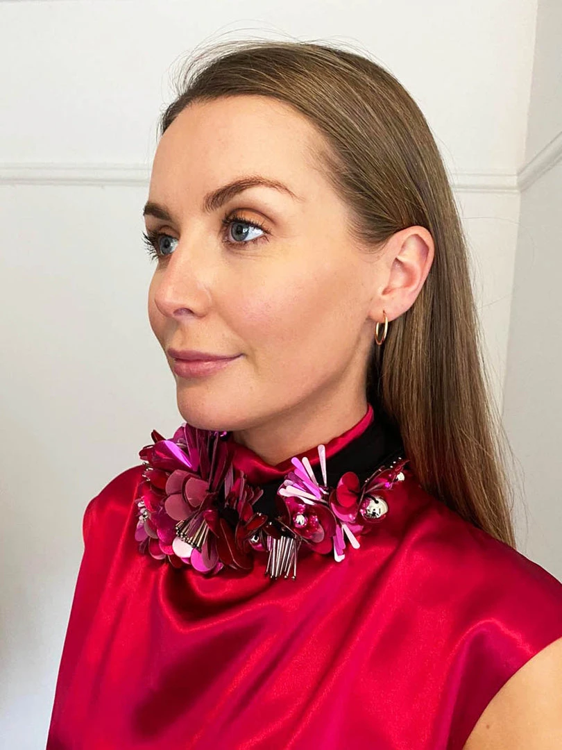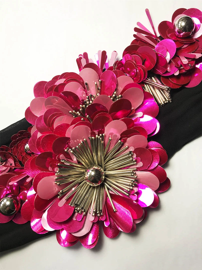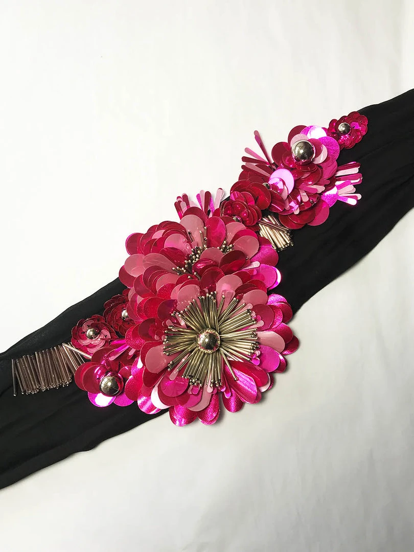 Dries Van Noten pink ‘Goodie’ embellished necklace featuring a long black fabric strap, a sequin and bead embellished floral design and a tie-wrap fastening. Made in India