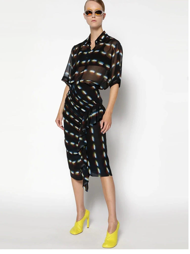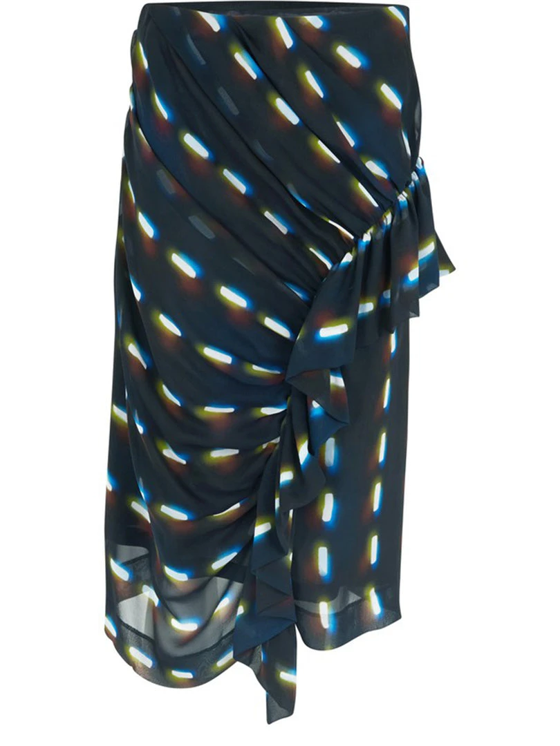 Dries Van Noten black ‘Syvan’ printed ruffle midi skirt featuring a side zip fastening, a pleated ruffle design on the side, a multicoloured abstract print and a midi length. This item is in collaboration with artist, Len Lye. Item fits true to size. Model is wearing a size 38 FR.