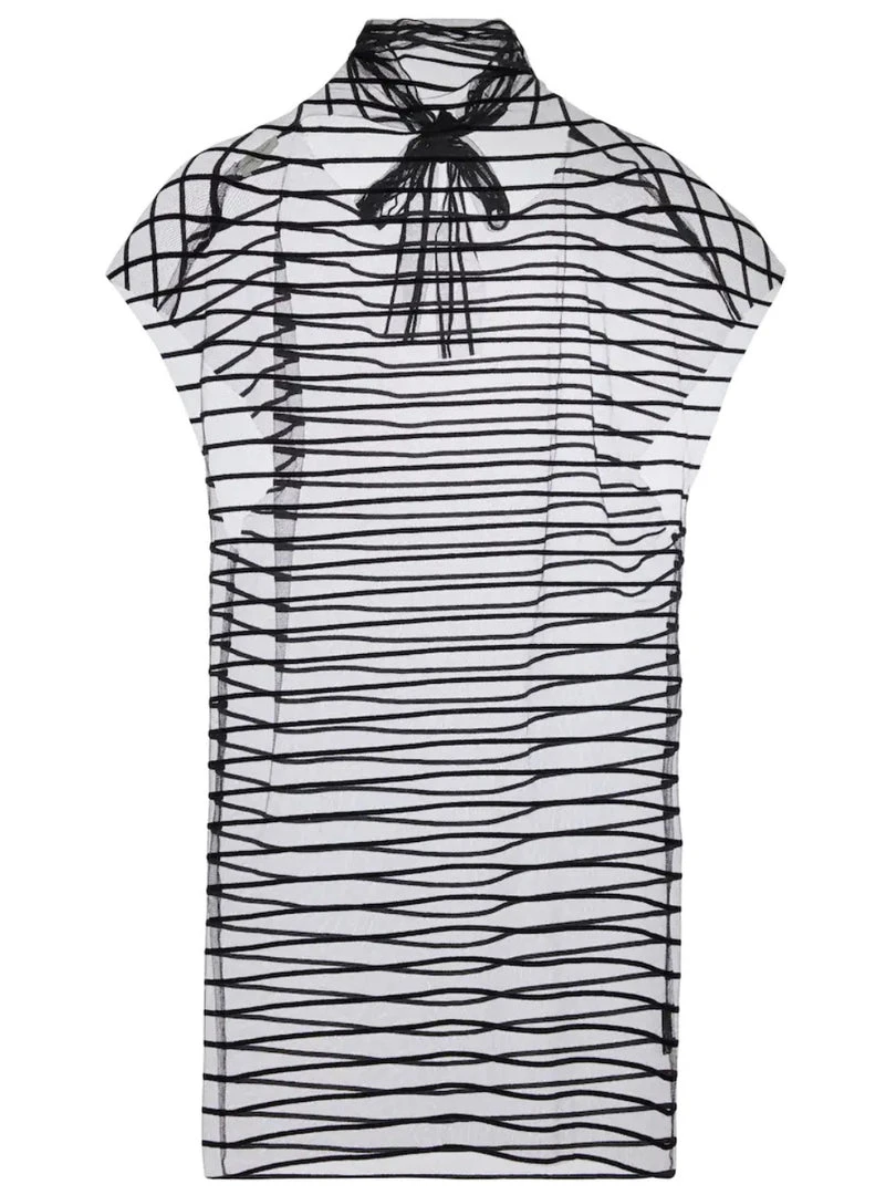 Dries Van Noten black ‘Sheer Mesh Stripe Over Blouse’ featuring a high neckline, a back tie-up fastening at the neck, capped sleeves, a textured stripe design, a midi length and pulls on. Item fits true to size. Model is wearing a size S.