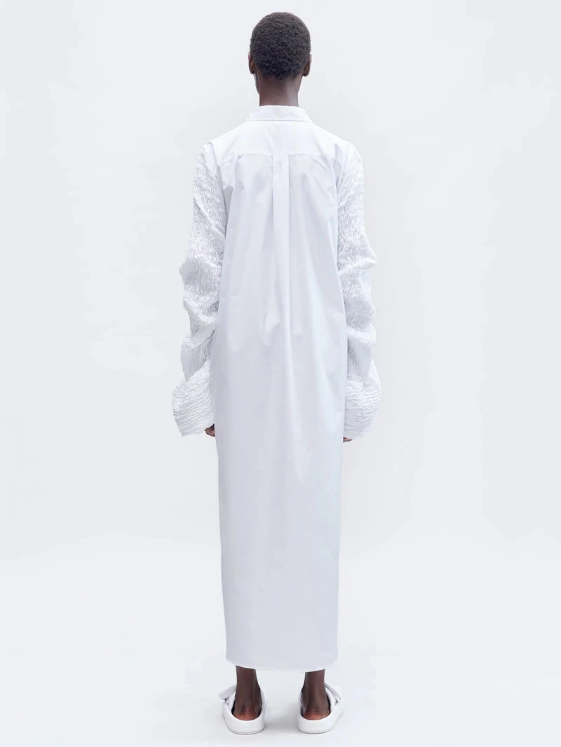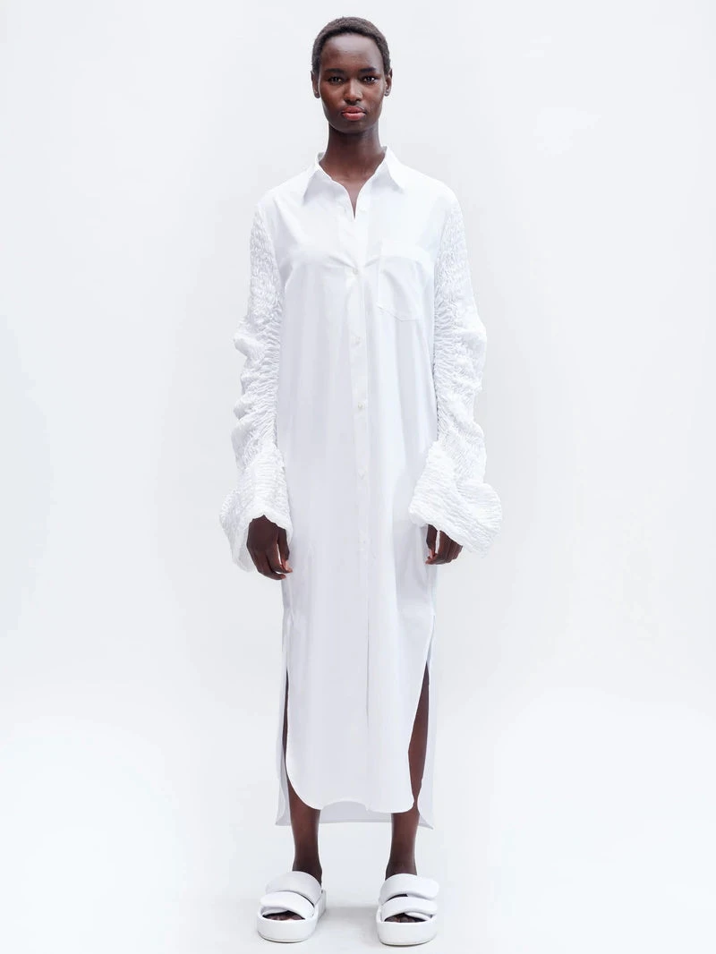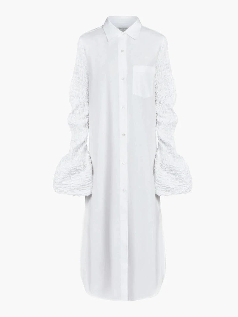 Dries Van Noten white ‘Dayla’ long shirt dress featuring a classic collar, front button fastenings, a front chest patch pocket, draped ruched and gathered smock sleeves with oversized cuffs, side buttoned pockets, a relaxed fit and side slits. Item fits true to size. Model is wearing a size S.
