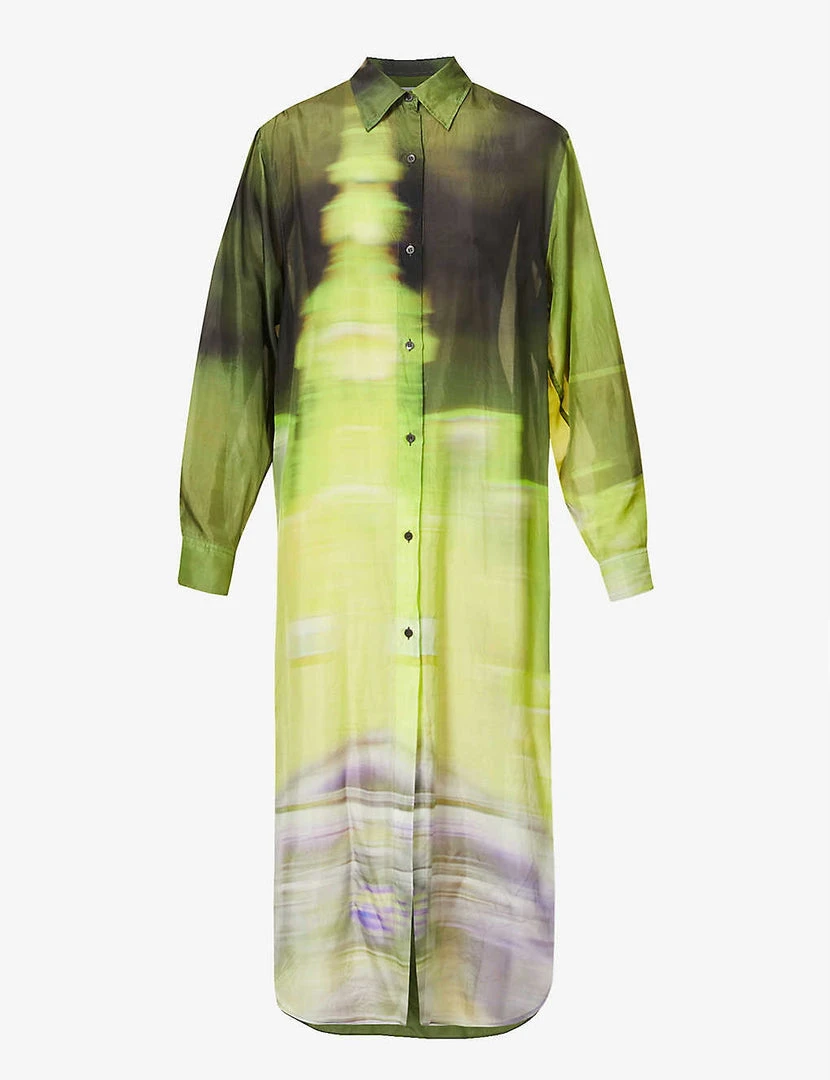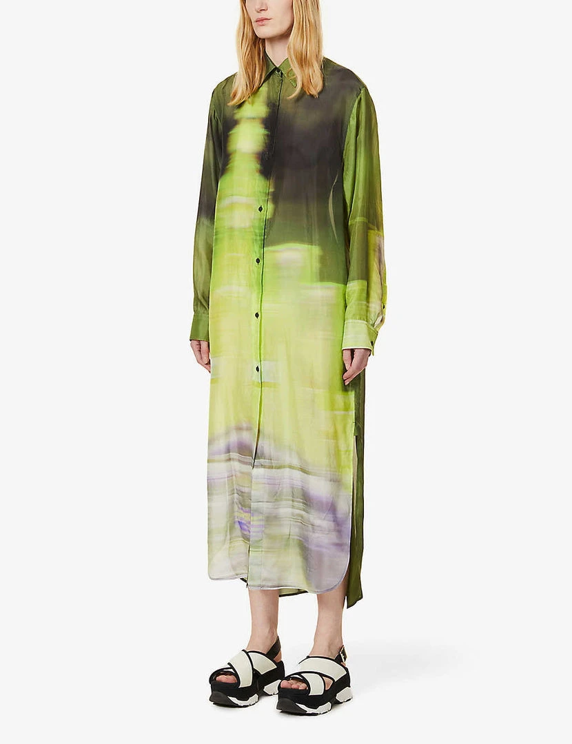 Dries Van Noten sheer oversized green and grey ‘Dayley’ shirt dress featuring a classic collar, front button fastenings, long sleeves with buttoned cuffs, side buttoned pocket details, an abstract print, side slits and a long midi length. Model is wearing a size XS.