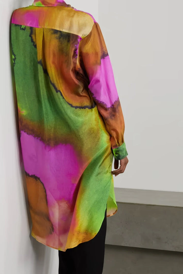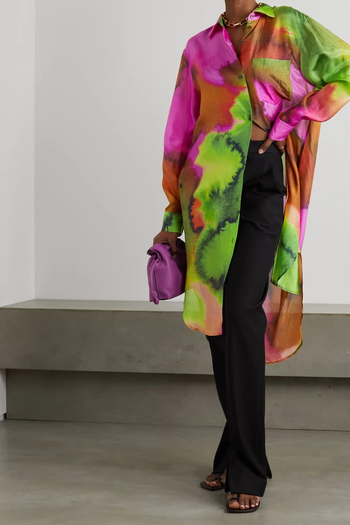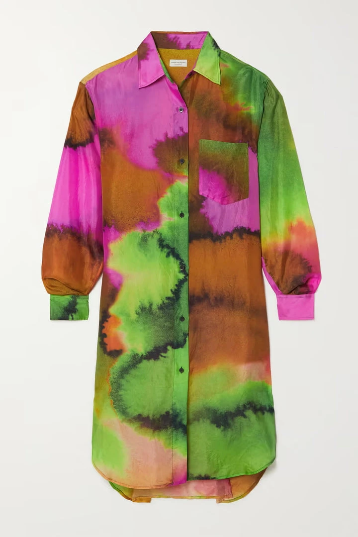 Dries Van Noten sheer oversized ‘Dayley’ shirt dress featuring a classic collar, front button fastenings, long sleeves with buttoned cuffs, a chest patch pocket, side buttoned pocket details, a multicoloured abstract print, side slits, a curved hem and a midi length. Model is wearing a size S.
